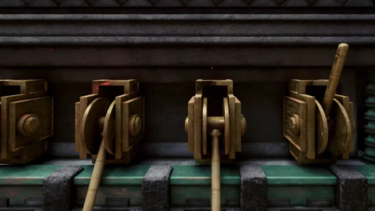 Начните с рычагов, расположенных в ряд. Важно правильно установить их положение: второй и третий рычаги слева необходимо опустить вниз, тогда как первый и четвертый должны остаться в верхнем положении. После этого обратите внимание на лебедку, скрытую за столом – ее нужно повернуть в правую сторону для завершения комбинации.