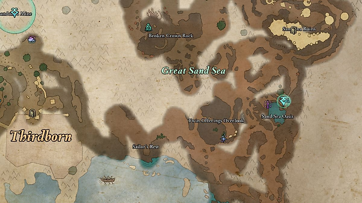 По сравнению с предыдущими двумя, Тауэ найти будет достаточно просто, но располагаться он будет достаточно далеко от них. Вы сможете его найти в в оазисе Песчаного моря, который расположен к северо-востоку от Третьерожденного. Тауэ будет на открытой местности, прямо напротив озера, так что вы его точно не пропустите. Кроме того, здесь также находится маяк для быстрого путешествия, из-за чего вам не придется далеко ходить. Плюс, если вы найдете Тауэ первым, то он расскажет о местонахождении Руанги и Ковхи.