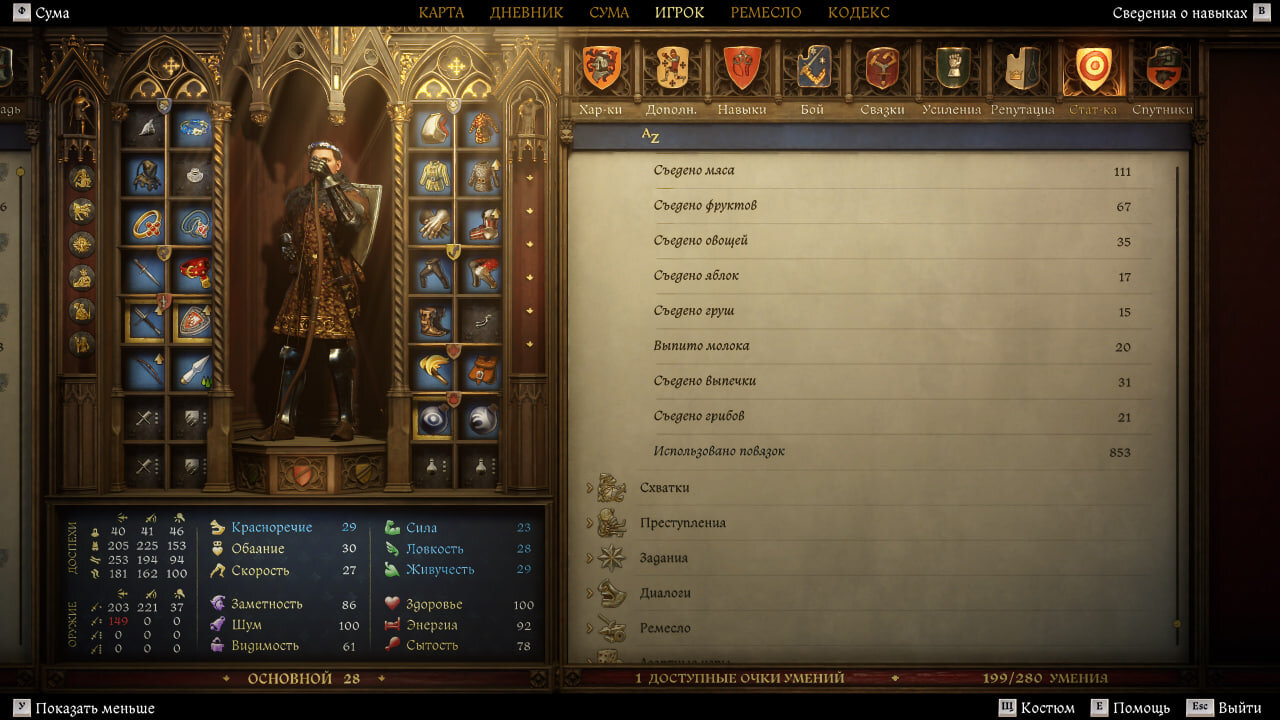 В меню «Игрок» – «Статистика» – «Общая» можно найти количество съеденного мяса и загрузиться, если вы случайно съели что-то не то. То же касается и убийств животных в разделе «Схватки» – счетчик должен быть на нуле.