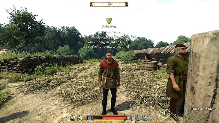 Третий и самый сложный противник – батрак Станик (Stanley). Предварительно можно спросить о том, как он относится к Тобиашу. Станик будет не только идти в контратаки, но и ставить блоки. Вам придется самому ставить блоки и затем контратаковать, чтобы одолеть Станика.