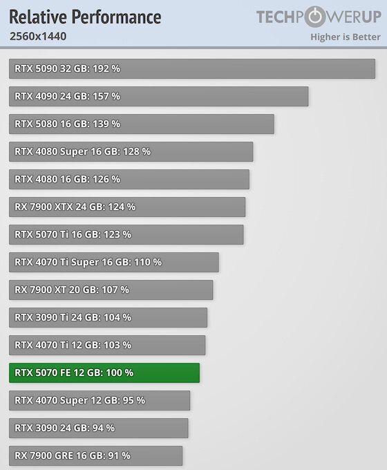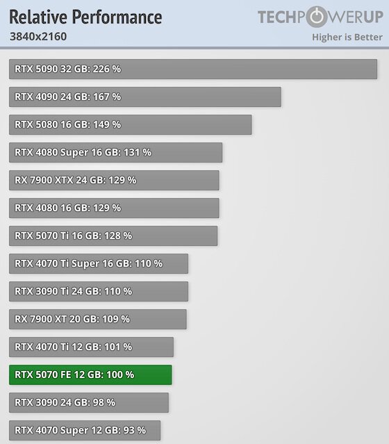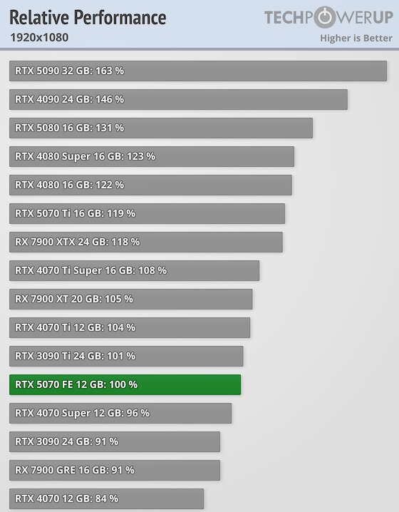 RTX 5070 оказалась на 5% быстрее RTX 4070 Super. При этом она на 3% медленнее RTX 4070 Ti и на 23% уступает RTX 5070 Ti.