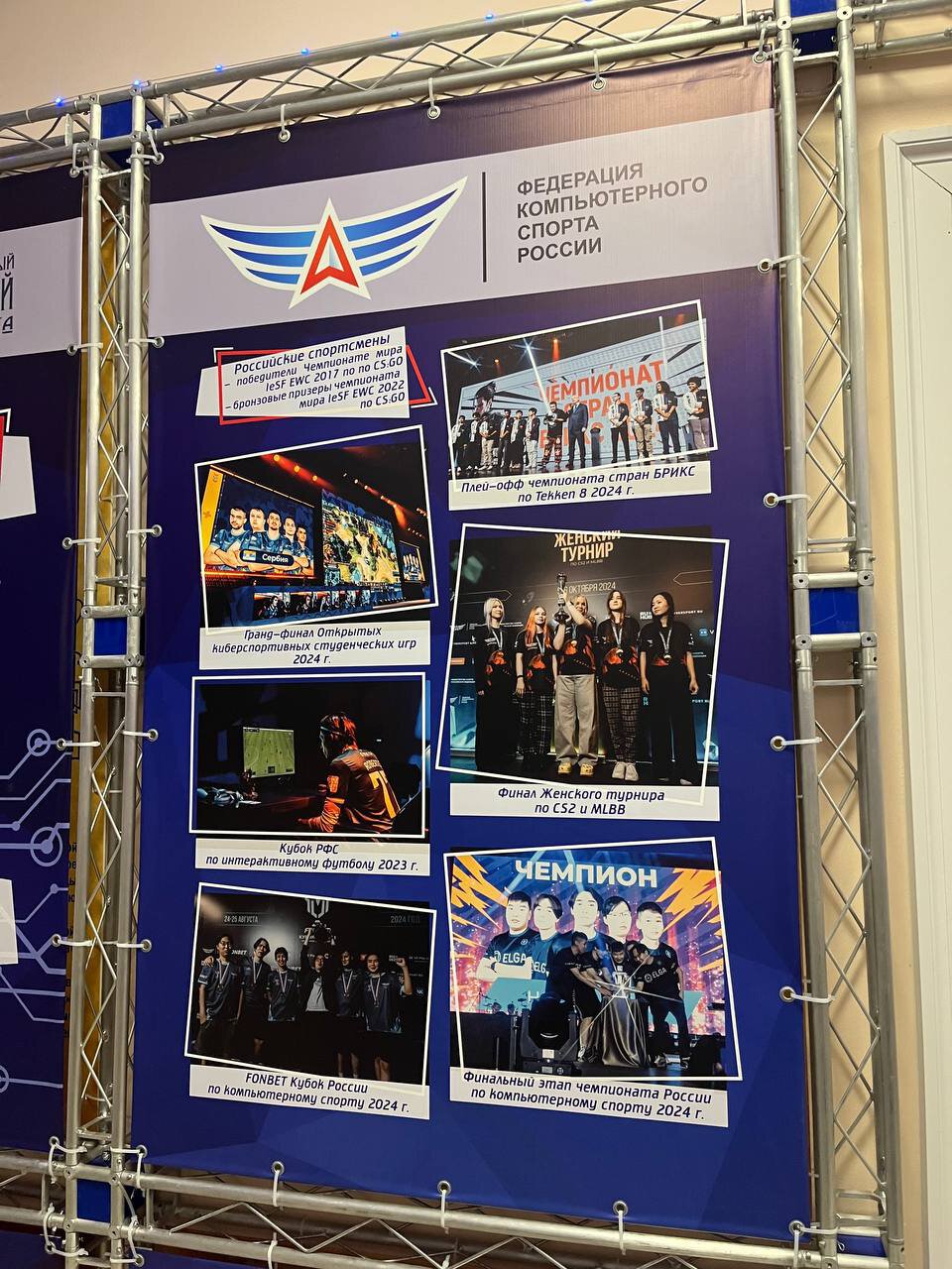 С такой же формулировкой можно было бы упомянуть победы на мейджорах (главные турниры в системе Counter-Strike) или The International (чемпионат мира по Dota 2), но про сами соревнования, как и их победителей, которые прославились на всю Россию, на стендах ни слова. Объяснение этому только одно: Федерация компьютерного спорта России — участник IeSF (Международной федерации киберспорта), поэтому регалии указаны лишь такие.