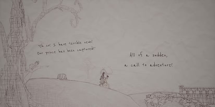 Начало может показаться скучным. Зои рассказывает историю спонтанно. В дневнике появляются записи с двумя персонажами, отправляющимися в лес. Где-то там в неведомых землях злые силы похитили принца, и теперь предстоит его спасти. Пока идет завязка, прыгайте на облака вместе с напарником по игре и готовьтесь к первой задаче.