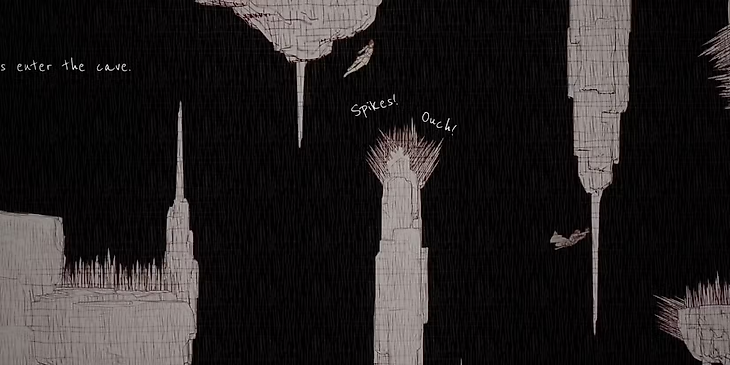 Чем ниже, тем становится темнее. Если ранее надписи в блокноте были черными по белому, то теперь становятся белыми по черному. Взаимодействуйте с партнером, чтобы видеть, куда направляться дальше, минуя шипы. Появятся летучие мыши. Возьмите луки, чтобы перестрелять их. Обратите внимание, где находится третья мышь. Она чуть позади выступа скальной породы, нужно тщательно прицелиться.