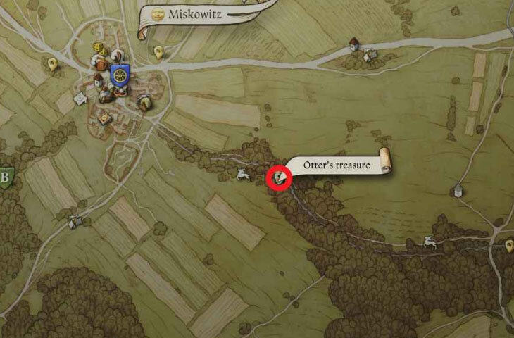 После завершения квеста с Выдрой на карте появится особая метка, указывающая на утес юго-восточнее Мышковиц. Спустившись к протекающему внизу ручью, внимательно осмотрите верхнюю часть скалы – там вы заметите характерный желтый кувшин с сокровищами. Добраться до кувшина сверху невозможно, поэтому единственный способ получить клад – сбить его со скалы. Для этого лучше всего использовать арбалет. Перед попыткой настоятельно рекомендуется сохранить игру, так как мешочек с сокровищами может упасть в труднодоступное место.