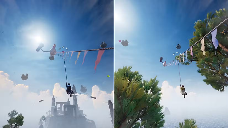 Пропуск любого из них лишит вас ускорения и возможности лететь. Вы упадете и завершите состязание. На пути попадаются несколько контрольных точек в виде плавучих платформ. На них можно отдохнуть, сделать паузу в случае необходимости. Ближе к концу появится еще один последний зиплайн. Добравшись до него вы вплотную приблизитесь к финишной черте. Если окажетесь у зиплайна раньше соперника, это будет означать фактическую победу.