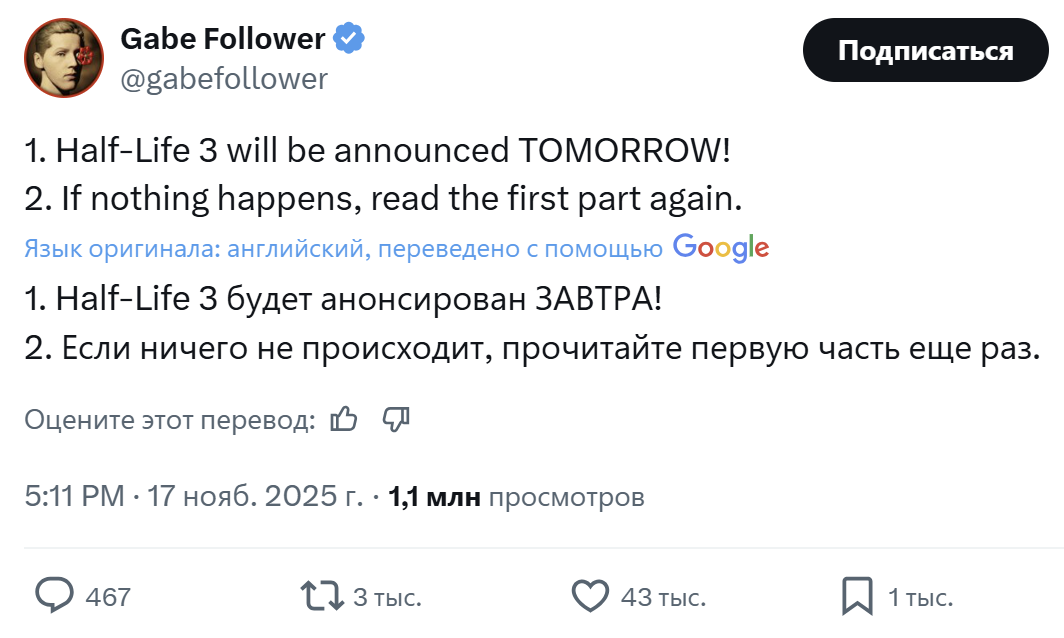 Авторитетный инсайдер GabeFollower прогремел – анонс Half Life 3 состоится 18 ноября. Вероятно, публикация может быть просто шуткой, ведь 16 ноября он написал: «Ничего не ожидайте, и вы не будете разочарованы». В соцсетях уверены, что еще одна возможная дата анонса – 19 ноября, годовщина выхода оригинальной игры. В соцсетях Valve пока не намекала на скорый анонс игры.