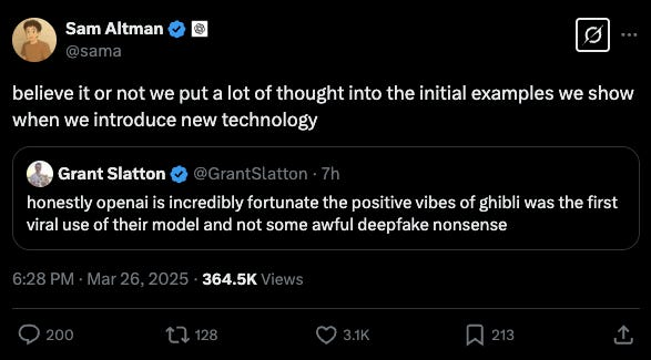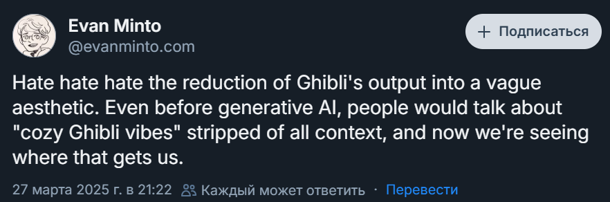 Так, автор портала Blood in the Machine Брайан Мерчант назвал разработку OpenAI «фабрикой мемов студии Ghibli, которая оскорбляет искусство». По его мнению, Сэм Альтман (генеральный директор OpenAI) продвигает новый генератор изображений, присваивая себе работу одного из величайших современных аниматоров.