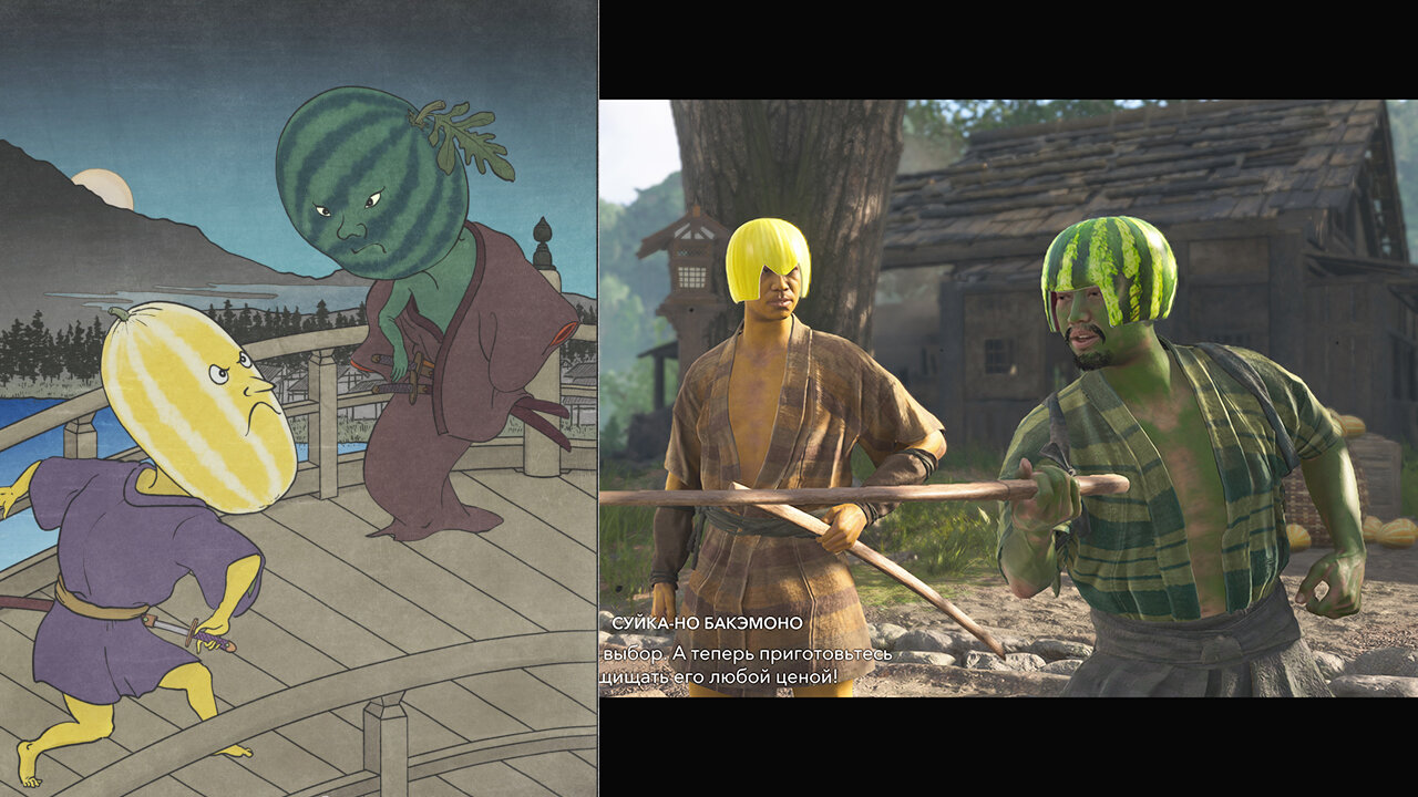 Японский фольклор не перестает удивлять – у японцев есть екай (дух) с головой арбуза, который называется «суйка но бакемоно» или просто «арбузный монстр». Есть иллюстрация приблизительно 1750 года, на котором арбузный монстр противостоит дынному монстру – и ее перенесли в игру в виде небольшого квеста. Когда главный герой узнает слух о том, что этот екай появился неподалеку от поселения, и проверит, то увидит обычных людей с арбузной и дынной коркой на голове.