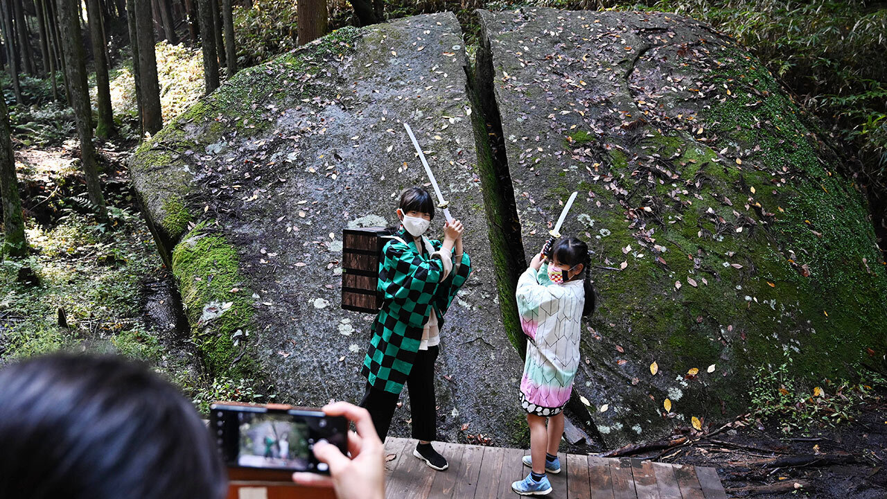 А в реальности у камня, который загадочным образом раскололся, трещина другой формы. Камень стал японской достопримечательностью, и с выходом «Клинка, рассекающего демонов» к нему стали приезжать толпы туристов.