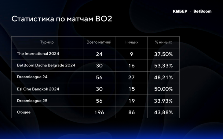 Bo2 – классика групповых этапов. Формат из двух карт и единственный, в котором возможна ничья. Правда, турнирные операторы понемногу отходят от этого формата и все чаще внедряют швейцарку с Bo3.