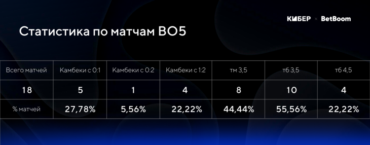 Серия до трех побед. Bo5 обычно используется в финалах турниров, так что довольно сложно оценивать статистику из-за небольшой выборки. С начала 2024-го прошло всего 18 матчей в таком формате на тир-1 сцене.