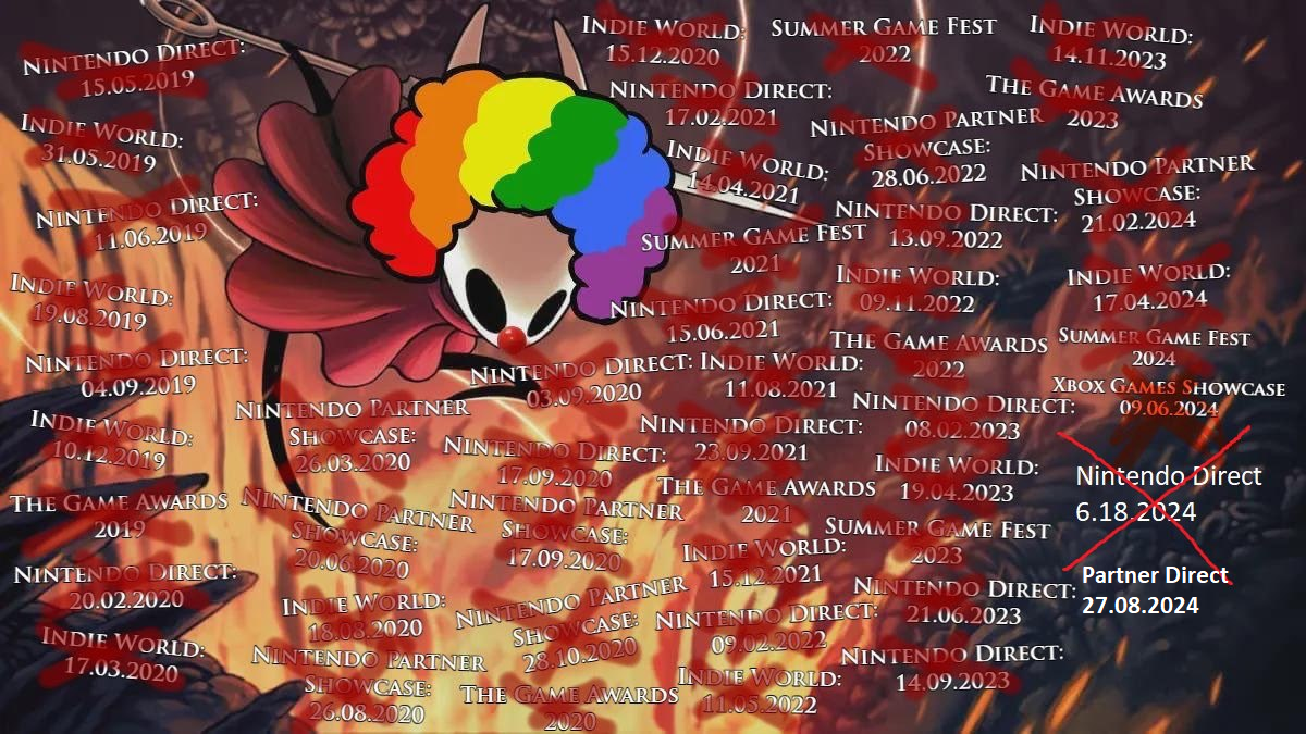 Практически перед каждой игровой презентацией появлялись инсайды о новом трейлере игры, а чаты трансляций мероприятий тонули в спаме лишь одного слова – Silksong. Градус истерии был настолько высок, что в августе 2024 года (в вишлисте 298 тысяч пользователей) Джеффу Кейли пришлось отдельно официально объявить, что на Gamescom НЕ покажут трейлер Silksong.
