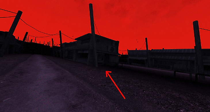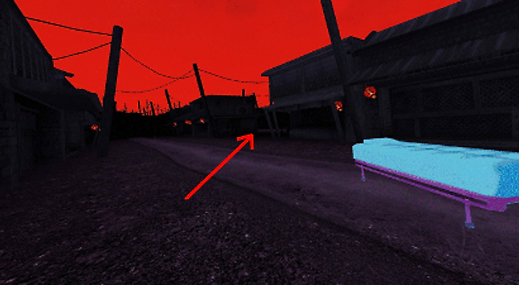 Расположитесь так, чтобы подушка кровати оказалась перед вами, и двигайтесь вправо между постройками.