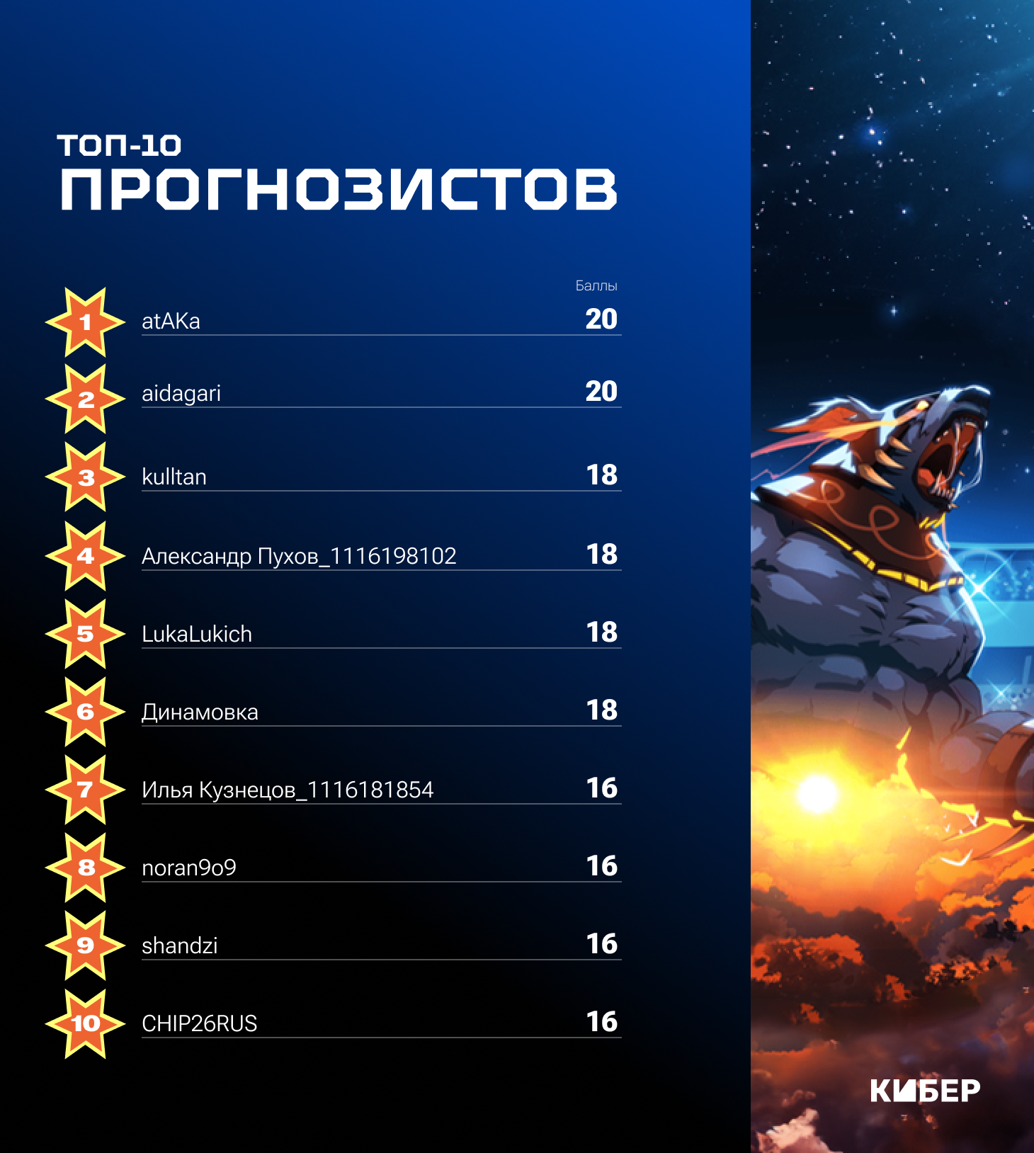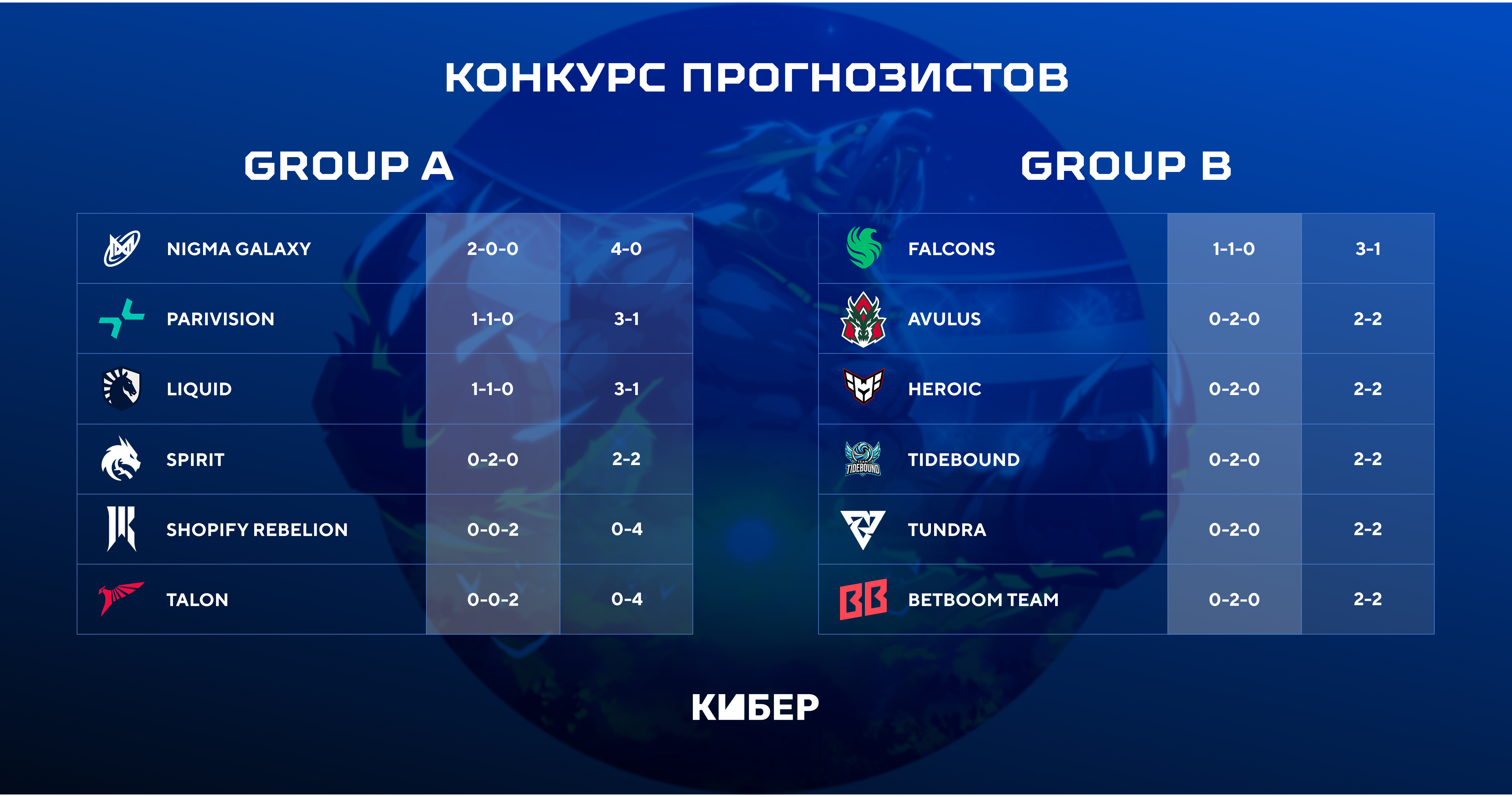 В конце каждого игрового дня мы будем публиковать пост с расписанием матчей на следующий день. Ваша задача – угадать результаты матчей. Собирать предикты мы будем в комментариях под ежедневными постами. В них же будем публиковать топ-10 прогнозистов.