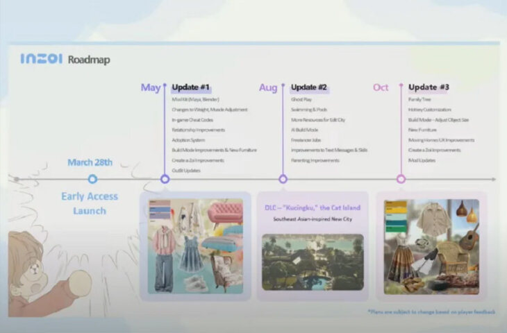 Каждое из запланированных обновлений призвано существенно расширить игровой опыт и добавить новый контент. Компания намерена планомерно развивать свой амбициозный проект, регулярно внося улучшения и дополнения. По заявлению создателей, такой подход позволит поддерживать постоянный интерес к игре и обеспечит долгосрочную поддержку проекта. График выхода обновлений распределен на весь 2025 год, что говорит о серьезных намерениях разработчиков относительно развития «inZOI».
