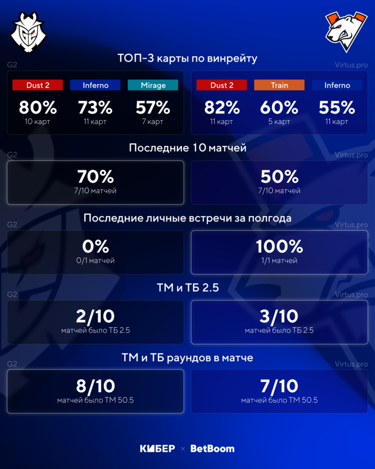 G2 постоянно банит Train, так что единственной картой, на которой VP может навязать борьбу, остается Dust 2. Здесь игра даже может перейти в овертайм, но G2 все-таки сильнее. На других картах российская команда не может противостоять даже GamerLegion – более слабой команде, чем G2. Поэтому верим, что команда M0nesy уверенно победит. На сайте BetBoom можно поставить на фору G2 по раундам (-6,5) с коэффициентом 1,85.