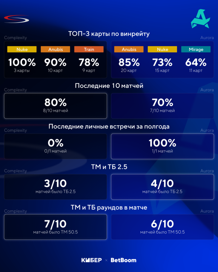 В пистолетных раундах обе команды показывают средние результаты. Complexity выиграла 60% пистолеток на этом турнире, а Aurora – 45%. Решающего преимущества ни у кого нет, так что рекомендуем присмотреться к точному счету пистолетных раундов на первой карте. На счет 1:1 BetBoom дает коэффициент 1,85.