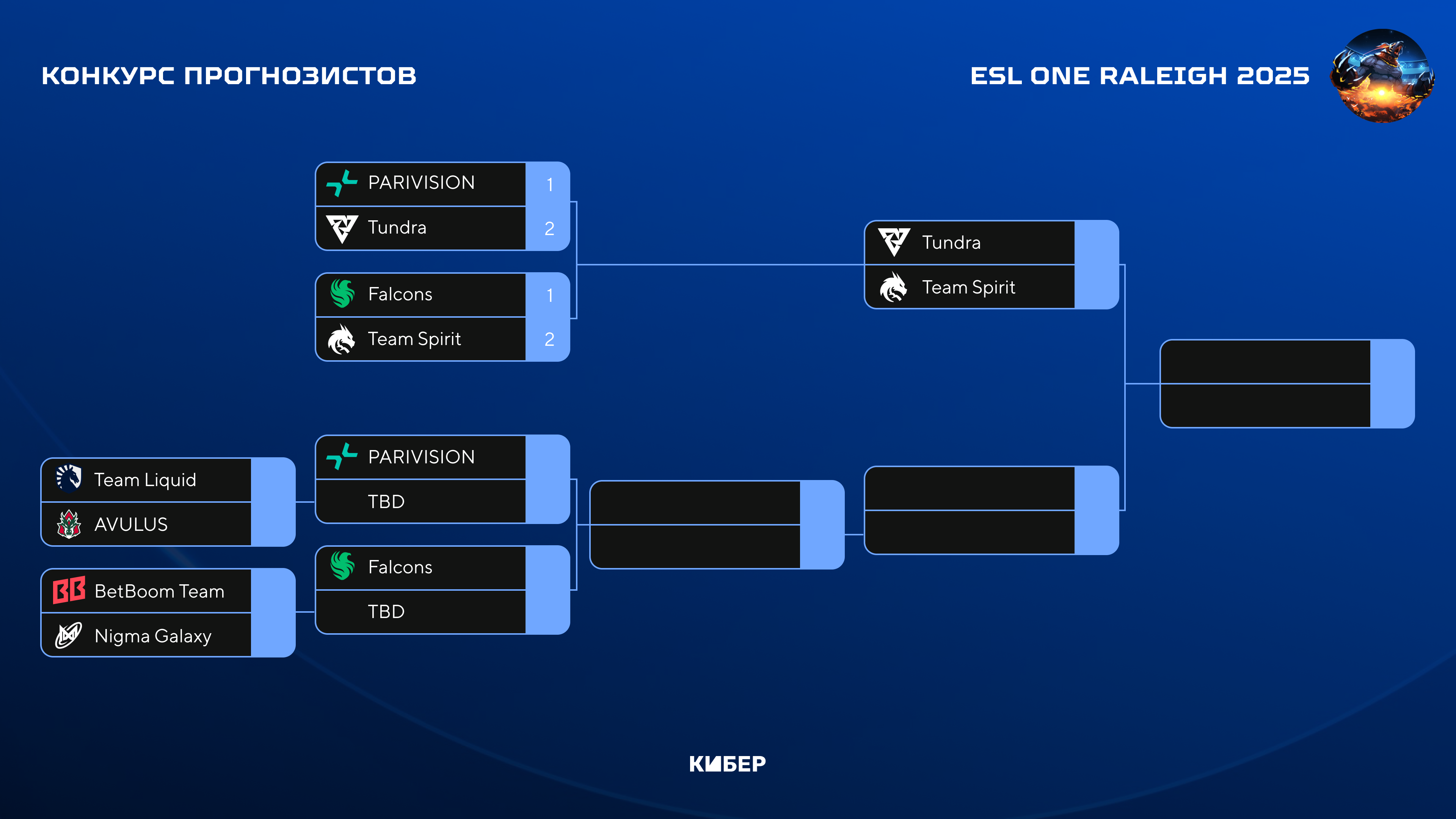 Привет! 7 апреля стартовал ESL One Raleigh. К турниру Кибер запустил конкурс прогнозов: пишите в комментариях предикты на матчи турнира, зарабатывайте баллы за верные прогнозы и выигрывайте призы.