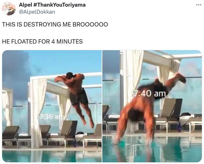 И заметили странные таймстейпы на видео: он прыгает в бассейн в 7:36, а приземляется в 7:40, то есть парит в воздухе 4 минуты. Это стало отдельным мемом из видео.