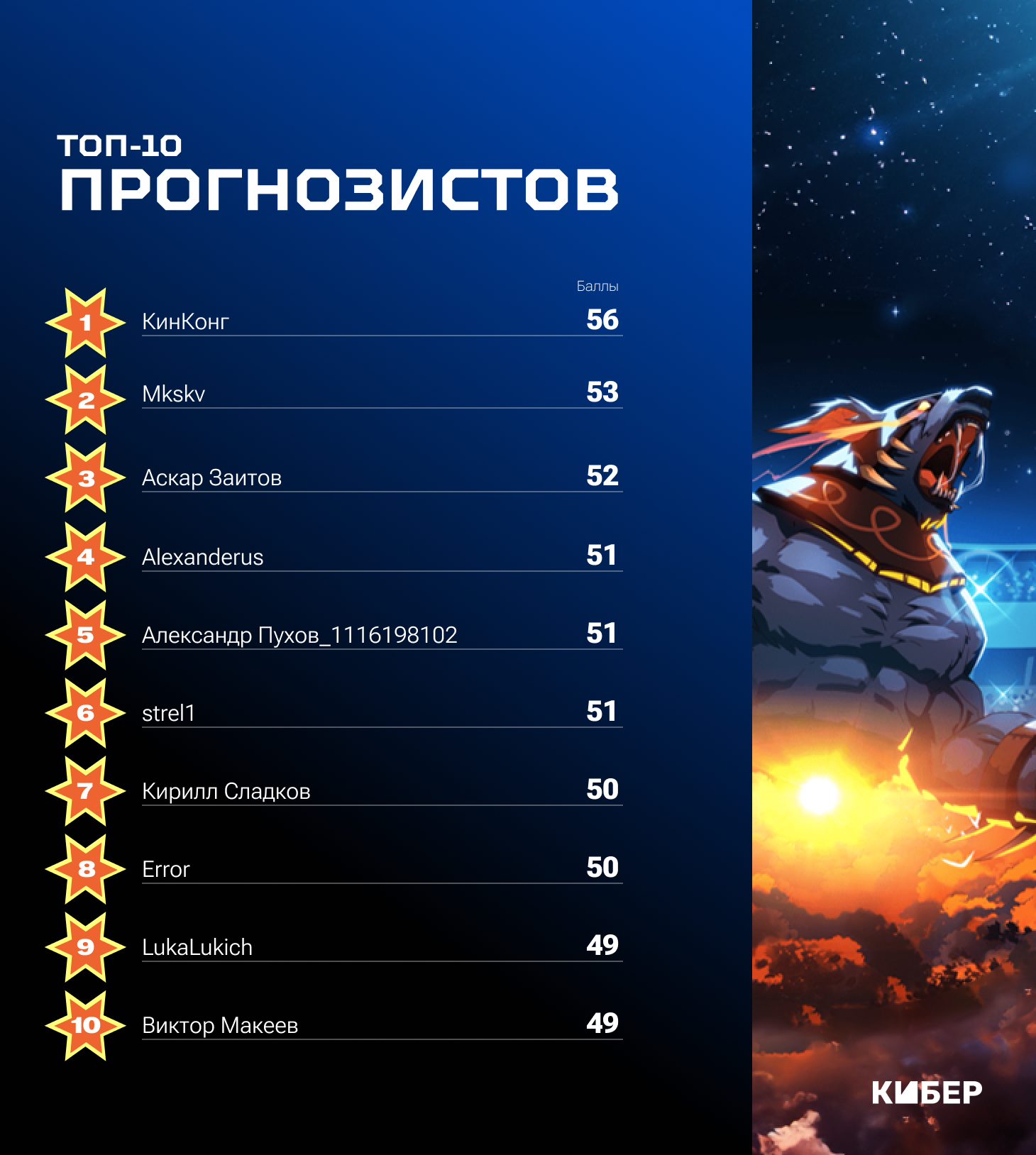 В конце каждого игрового дня мы будем публиковать пост с расписанием матчей на следующий день. Ваша задача – угадать результаты матчей. Собирать предикты мы будем в комментариях под ежедневными постами. В них же будем публиковать топ-10 прогнозистов.