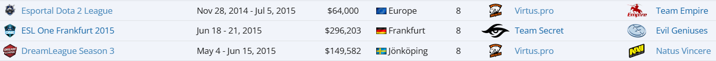 В 2015-м было два тир-1 турнира с двумя нашими командами в финале. Это 3-й сезон Дримлиги (чтобы вы понимали, скоро будет 26-й) и некий Esportal Dota 2 League.