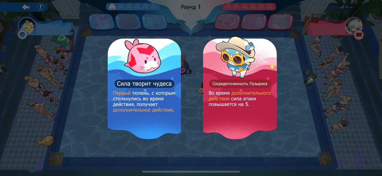 Во время боя между раундами игра предлагает одну из трех пассивок на выбор. Берите пассивки на дополнительный ход, силу атаки и скорость запуска. Если появляется бафф на определенного тюленя, обязательно берите его. Если вы играете на поле с шипами, лучшей пассивкой будет отключение урона шипов. Хилерские и на полное здоровье стоит брать в онлайн-битве, если ваш соперник играет очень агрессивно и настакивает баффы. Из самых бесполезных пассивок только замена смайликов, ее можно игнорировать.