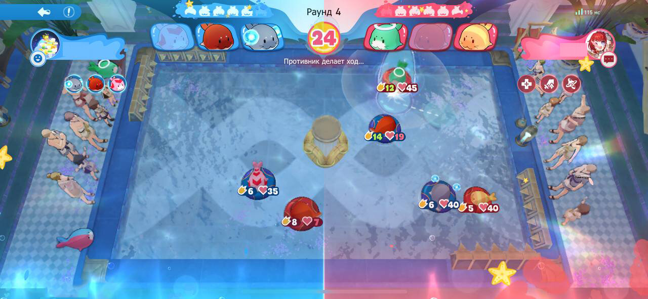 Красный тюлень будет доступен после победы над Дедеем. Добавьте его в команду, возьмите Цистерну или тюленя в повязках, а также хилера. Можно пойти агрессивно и взять вместо Ангельского Могучего на бафф атаки, потому что ИИ – не самый сложный соперник. Но если вам удобнее играть с хилером, лучше оставить Ангельского в команде. Битва осложняется тем, что по бокам бассейна расположены стены с шипами, которые наносят 3 урона при прикосновении. Поэтому старайтесь не оставлять своих тюленей рядом с этими стенами, потому что сильный удар врага заставит их отскочить в стену несколько раз и получить много урона.