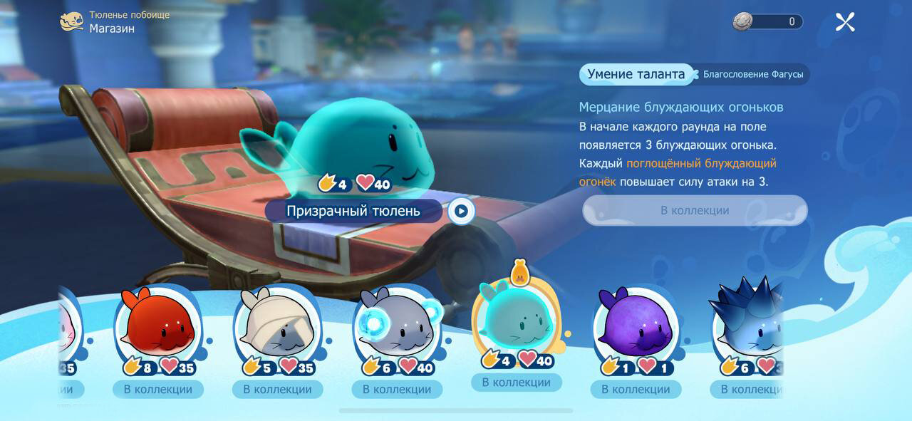 В начале игры в вашей команде всего два союзника – обычный тюлень и химера Пузырик. Зайдите в магазин и купите Могучего тюленя – это отличный саппорт, который будет полезен до конца игры. Перед началом игры поставьте его на первое или третье место, так будет удобнее. Когда он сталкивается с союзниками, то дает им бафф силы атаки до конца раунда, поэтому старайтесь запустить его сразу в двоих союзников.
