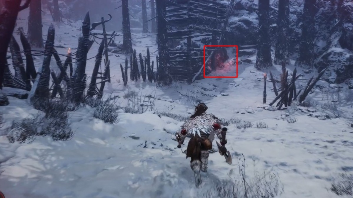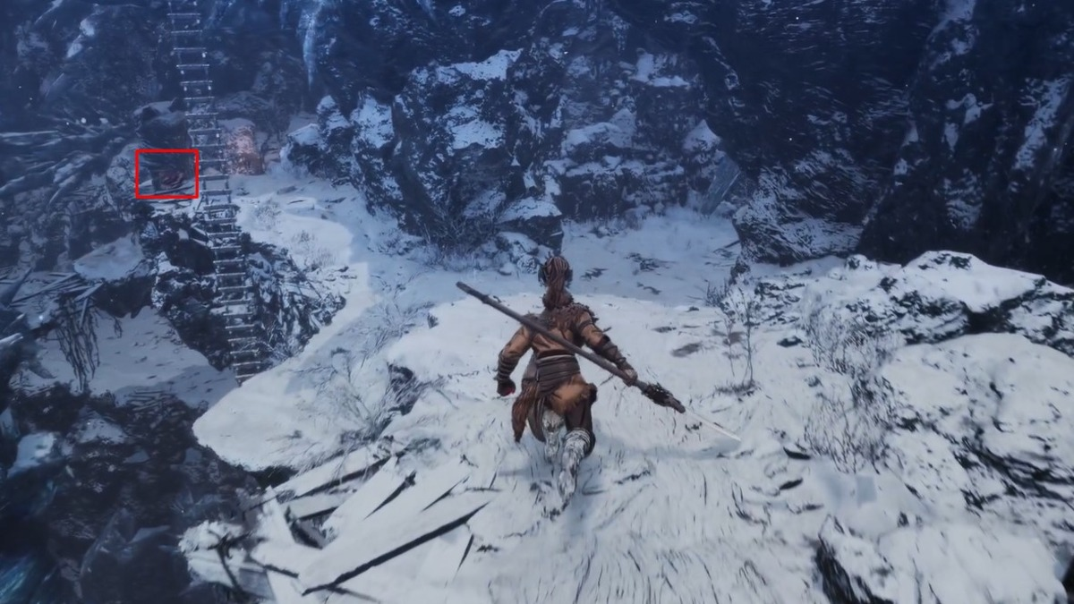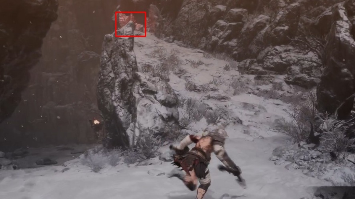 От Снежного поля идите по тропе вперед. Вскоре увидите диких собак и выйдите на открытое пространство с наклонным деревом вдалеке. На экране в этот момент должен появиться текст с руководством по метанию копья. Сверните налево, увидите камень, спрятанный в углу.