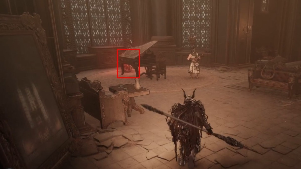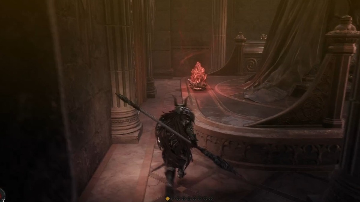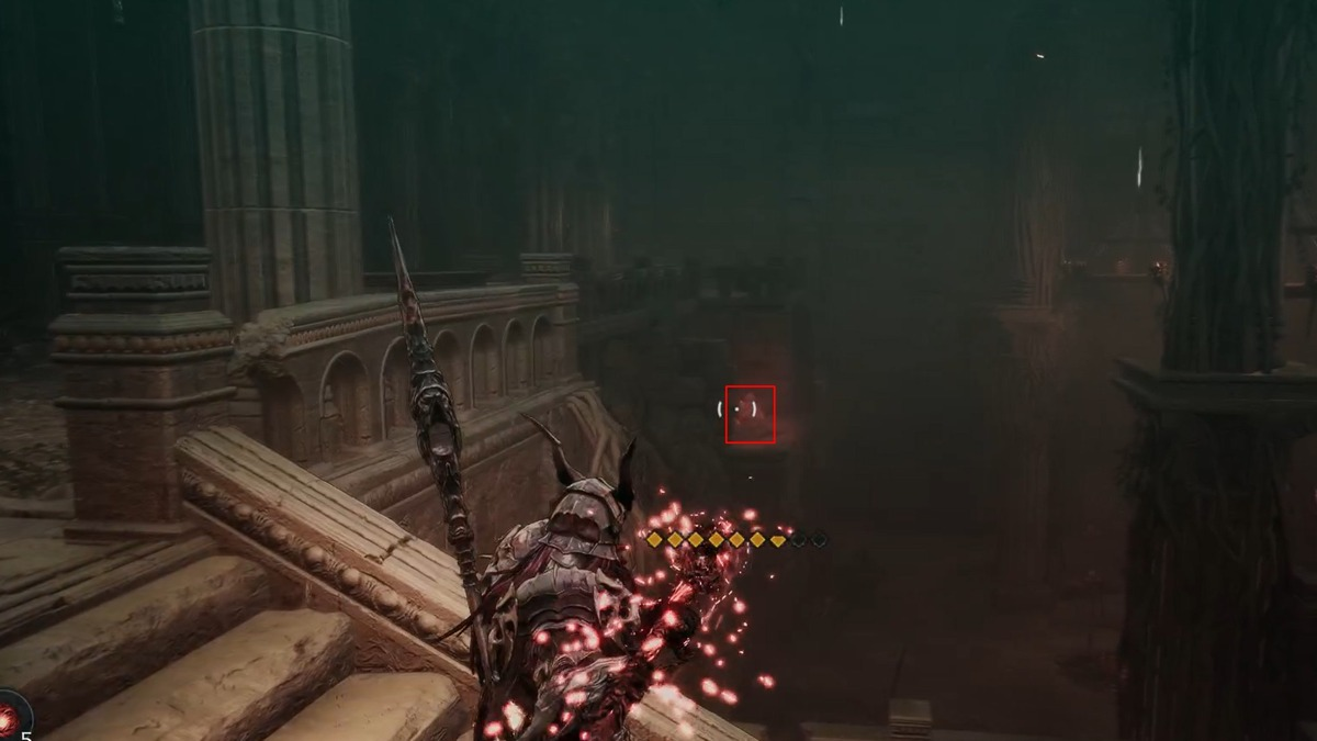 Поднявшись до верхнего балкона, подойдите к очередной лестнице с левой стороны и посмотрите напротив от нее. Присмотритесь и увидите еще один камень души. Без копья не обойтись и здесь.