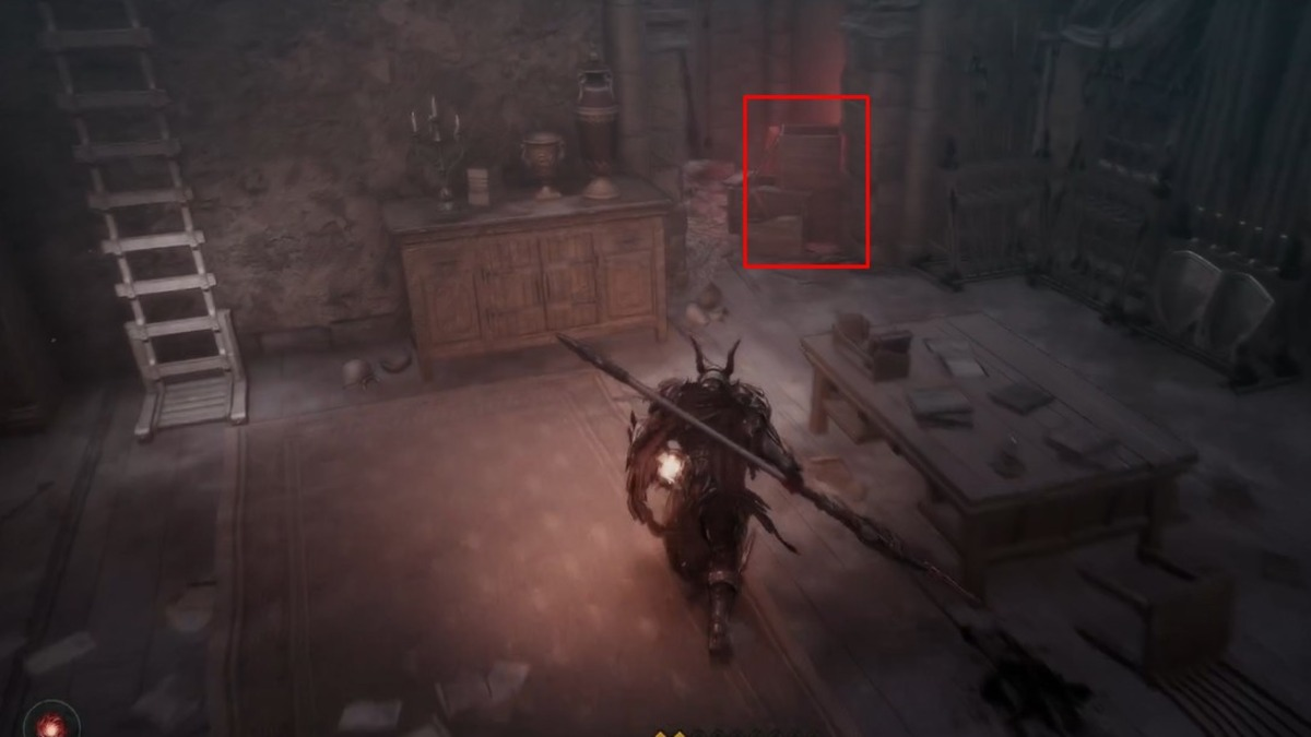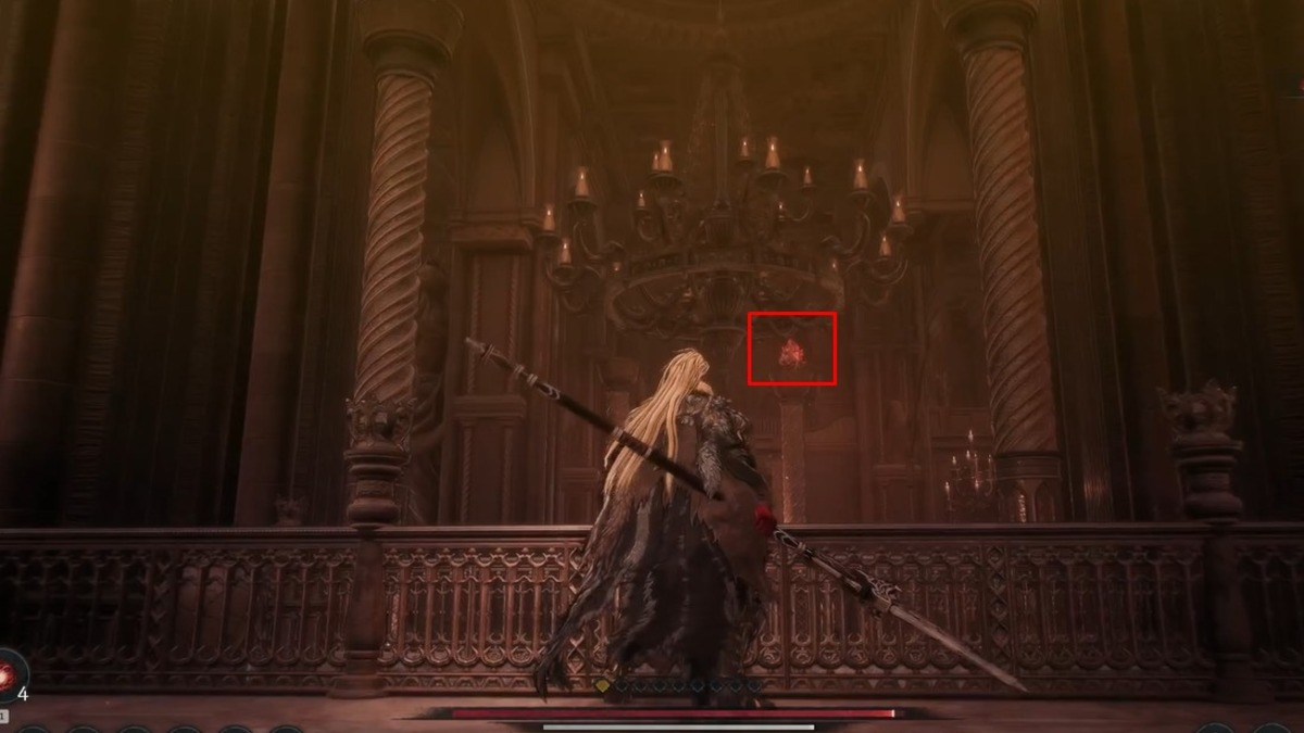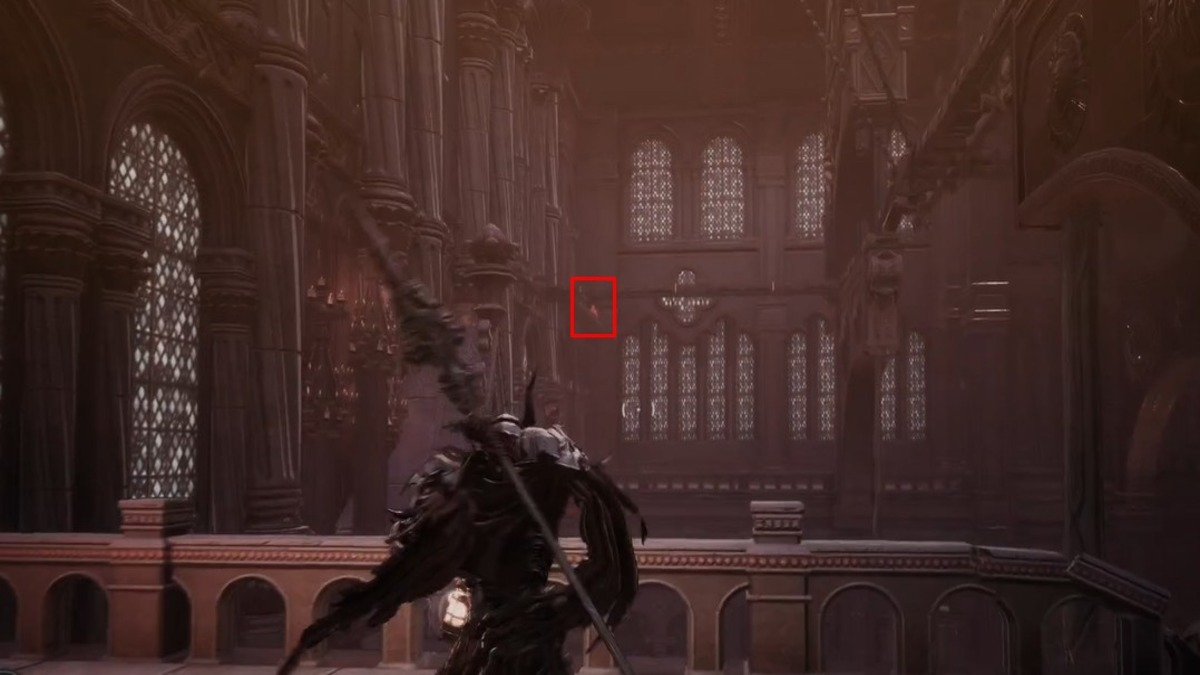 Когда доберетесь до библиотеки, поднимитесь по винтовой лестнице. Наверху поверните направо и поднимитесь еще выше по лестнице рядом с книжными полками. Спуститесь с другой стороны, поверните налево и идите прямо к книжной полке. Взаимодействуйте с ней, чтобы открыть скрытый проход. Пройдите по секретному пути и поднимитесь по следующей винтовой лестнице. Наверху продолжайте идти вперед. Примерно на полпути остановитесь и посмотрите налево. На вершине колонны около люстры находится очередной камень души. Используйте копье, чтобы разбить его.