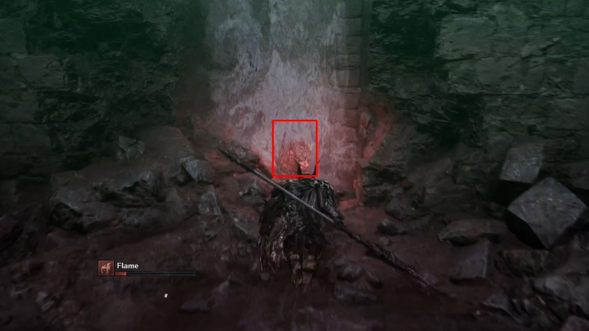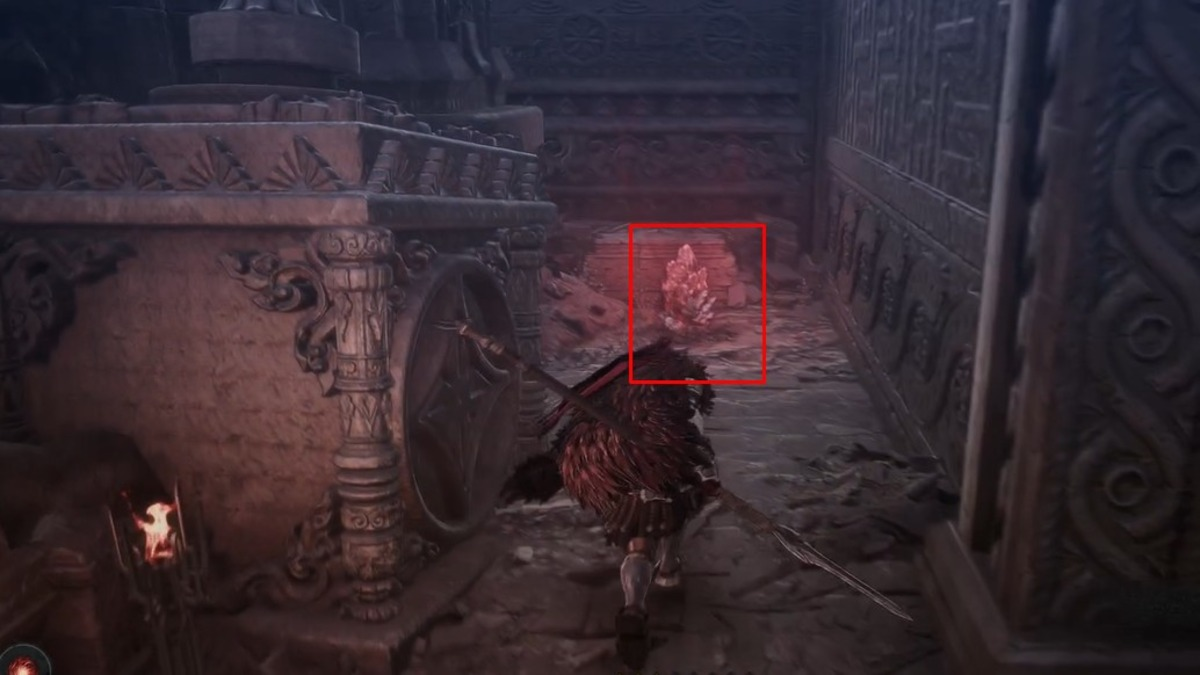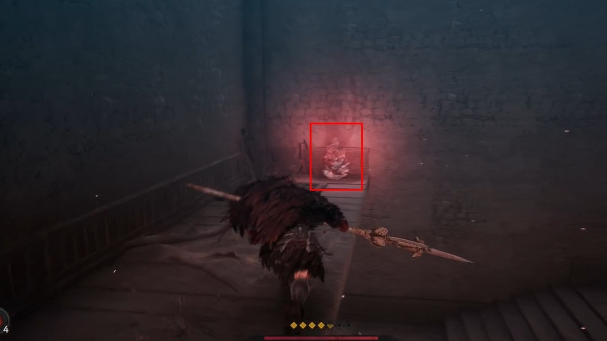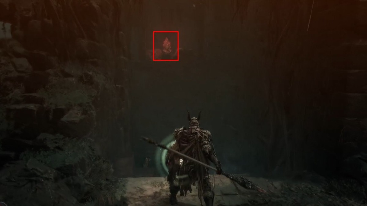 От точки перемещения в Пещере Отшельника пройдите через большую дверь вперед и спуститесь по лестнице. На первом перекрестке следуйте по тропе справа, пока не дойдете до закрытых ворот. Затем поверните налево и поднимитесь по лестнице. Посмотрите направо и увидите камень души на выступе рядом со свечами. Используйте копье, чтобы разбить его.
