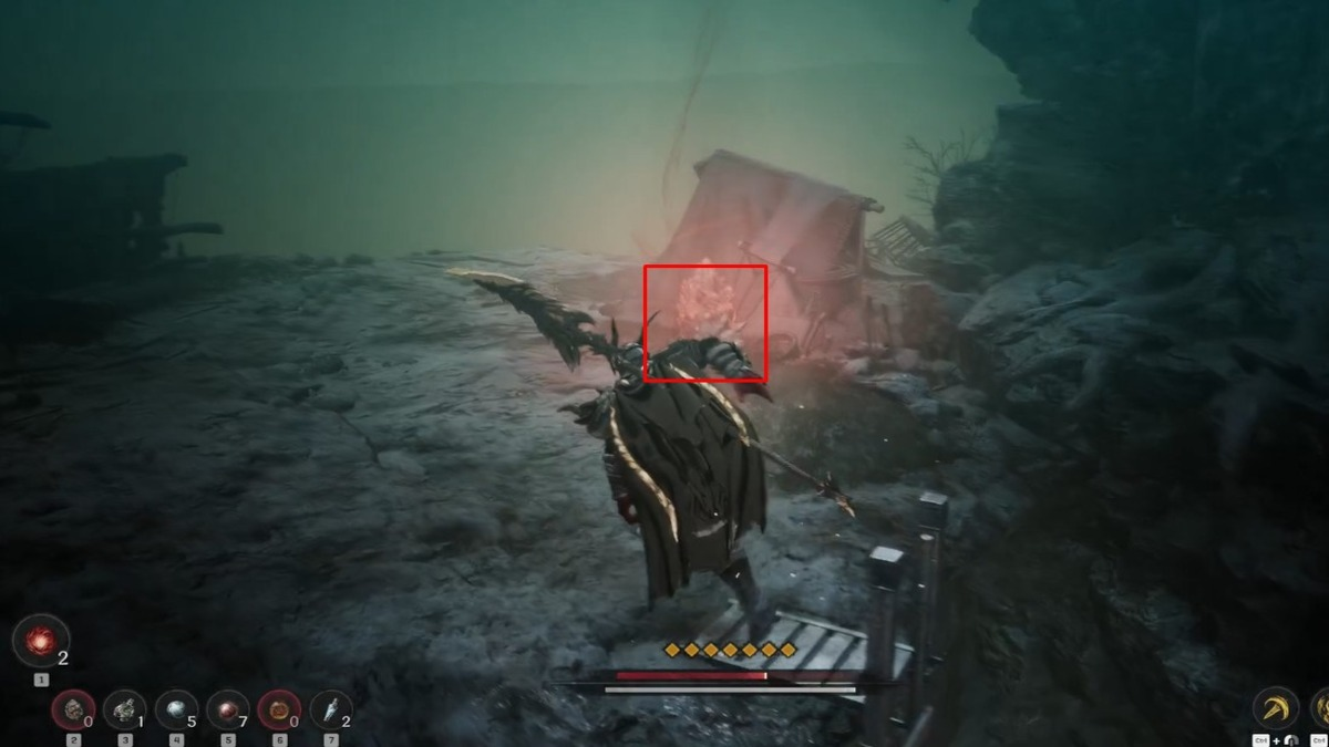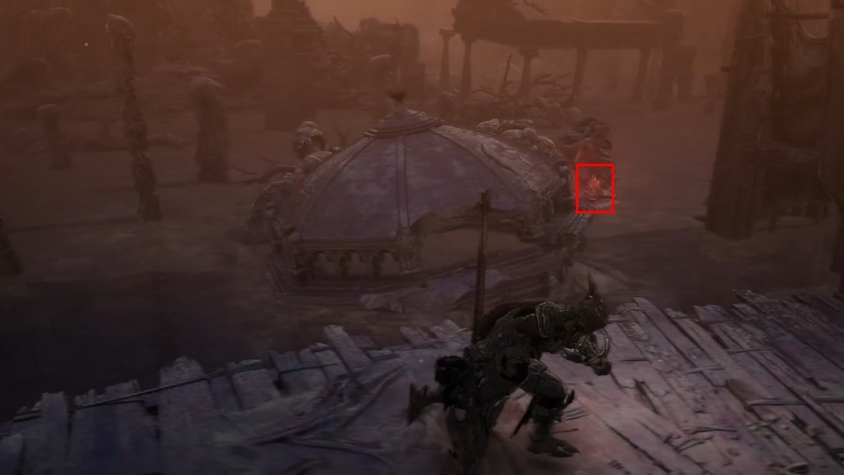 Из точки быстрого перемещения у Моста Абиссаль войдите в портал, который находится рядом. Перейдите деревянную платформу и следуйте по тропинке. Затем поднимитесь по лестнице и пройдите по деревянному мосту. Продолжайте идти по тропинке, пока не увидите лестницу, ведущую к скрытой в тумане арке. Поверните налево, камень души находится чуть ниже деревянной платформы около куполообразного, затонувшего здания.