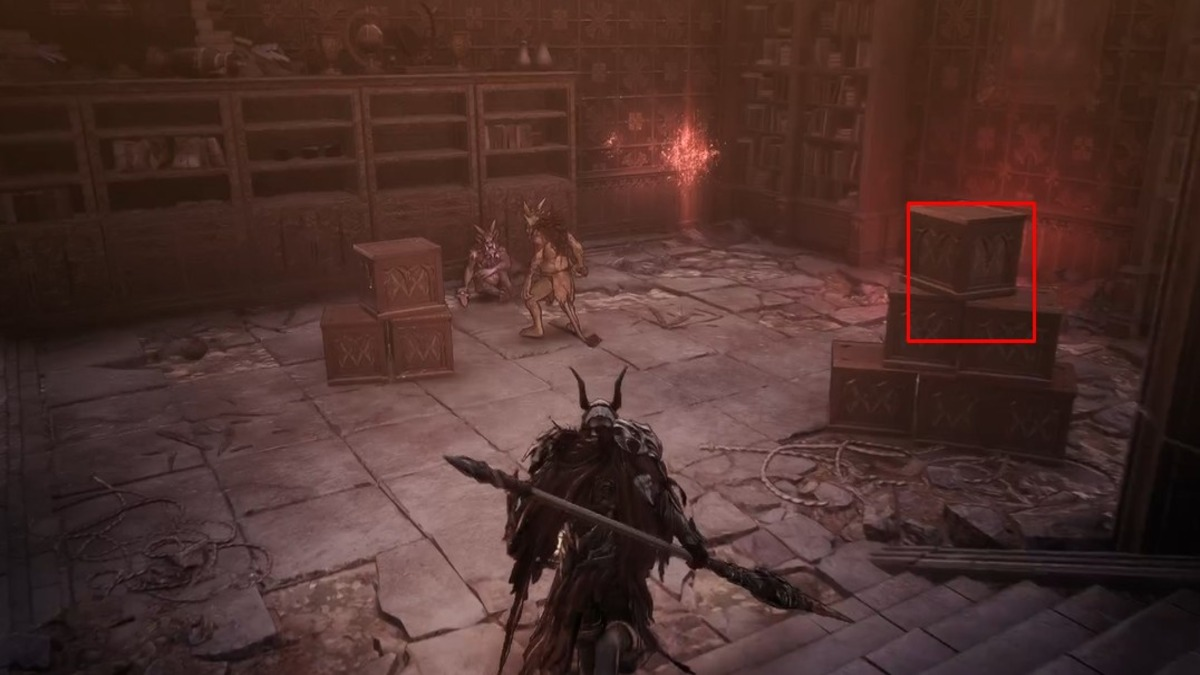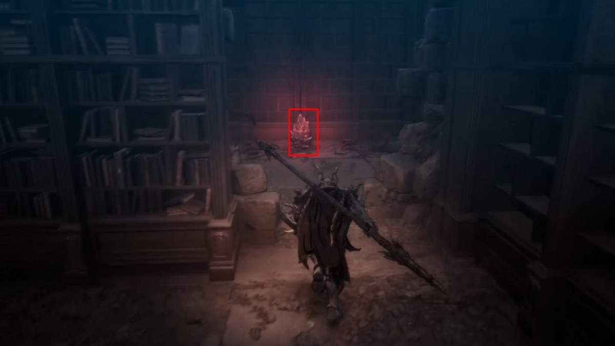 Когда спуститесь по лестнице из первой небольшой библиотеки, поверните налево и на выступе под дорожкой обнаружите очередной камень души. Понадобятся копье или камень, чтобы разбить его.