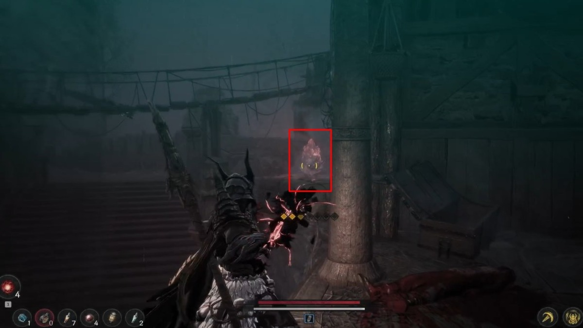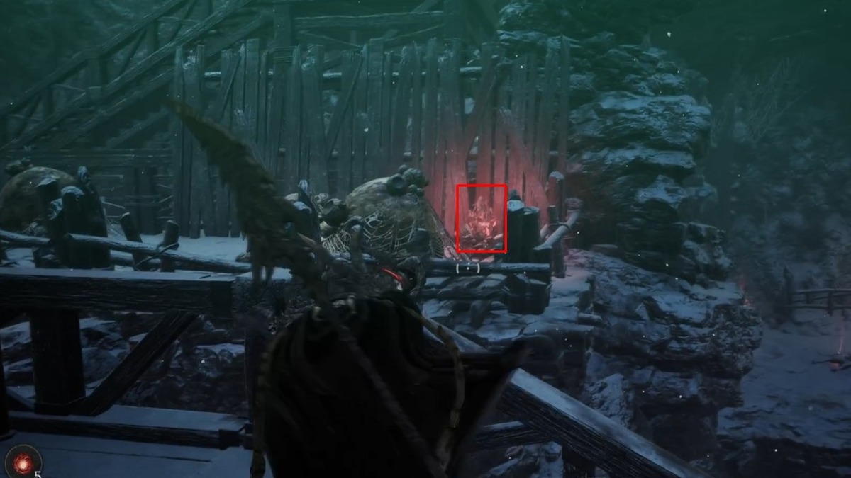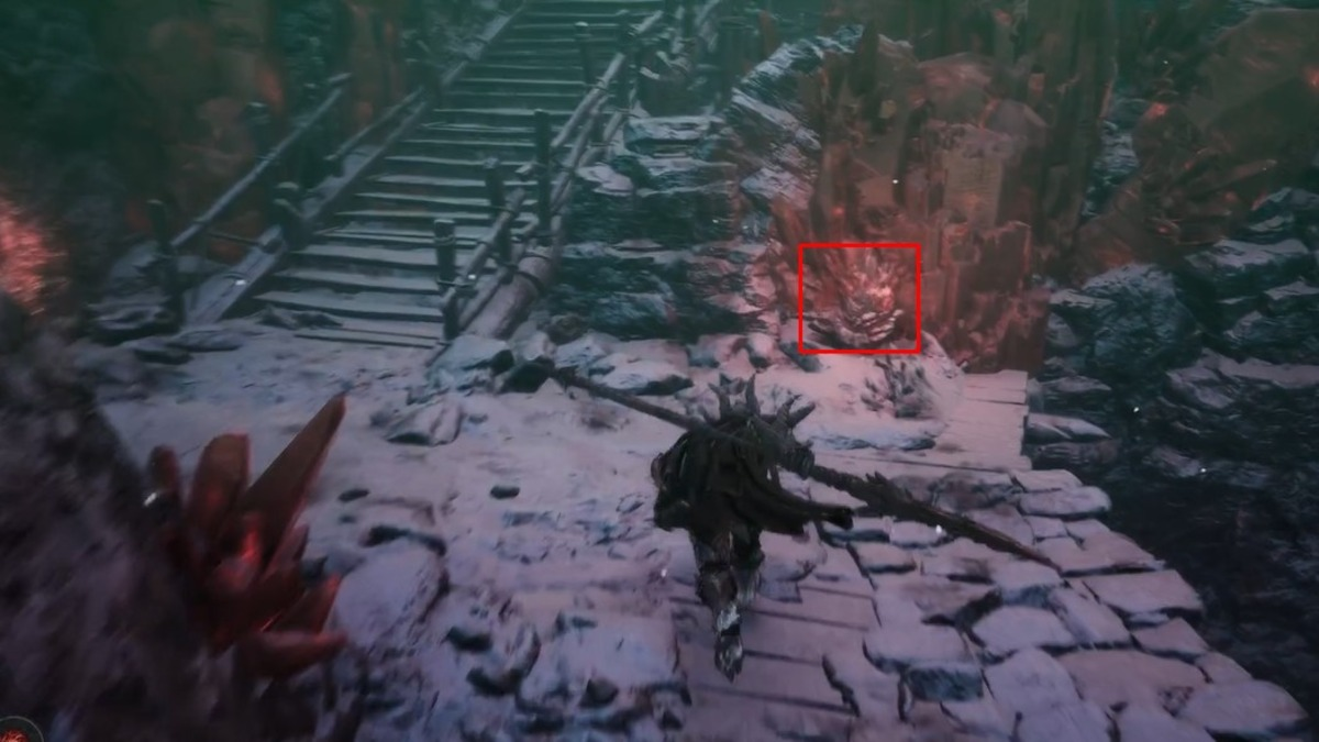 Пройдя по краю каньона, поднимитесь по лесам и продолжайте идти по главной тропе, где увидите первую летучую мышь. Сразитесь с ней, следуйте далее и увидите сломанный мост рядом с яйцами паука. За ним на выступе находится камень души. Разбить его можно копьем или бросить камень.