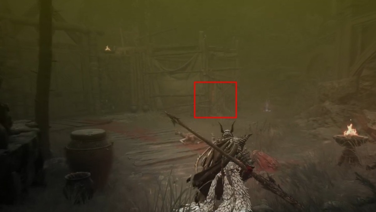 Пройдите по балкам с правой стороны и посмотрите через металлические ворота. На той стороне находится камень души. Разбить его поможет копье.