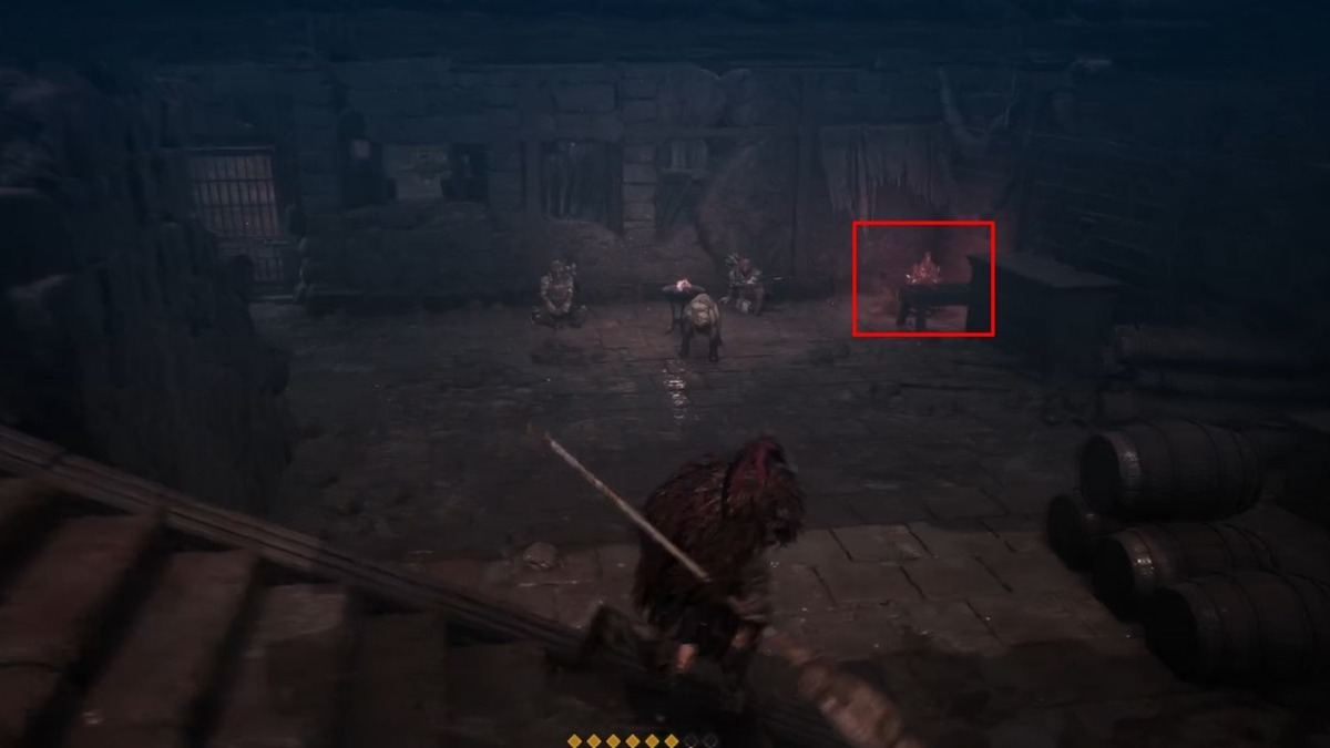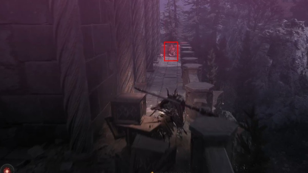 После победы над Элитным врагом поверните налево и пройдите мимо тележки и бочек. Следуйте прямо, сразитесь с врагом, а затем выйдите на балкон. С левой стороны найдете камень души.