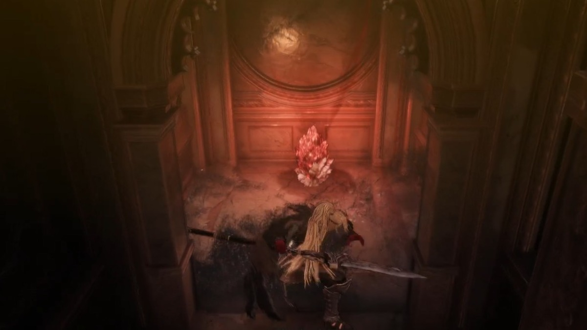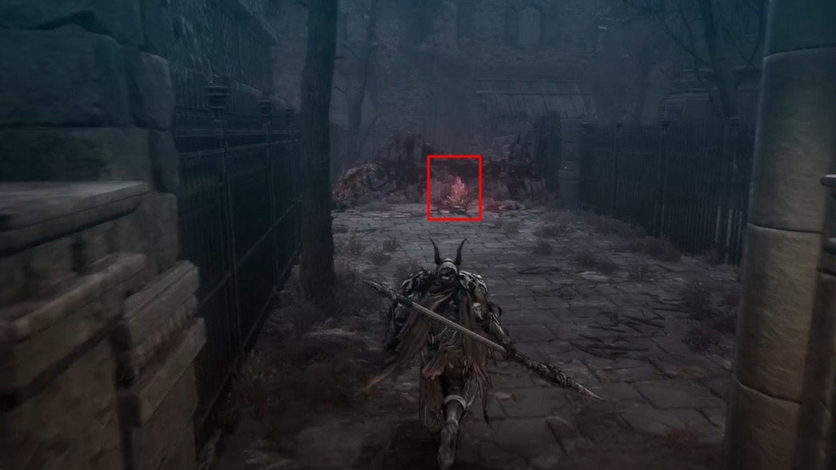 От точки перемещения Часовни двигайтесь к большой двери и откройте ее. Идите прямо мимо фонтана. Когда достигнете ворот, заблокированных обломками, посмотрите направо и увидите камень души.
