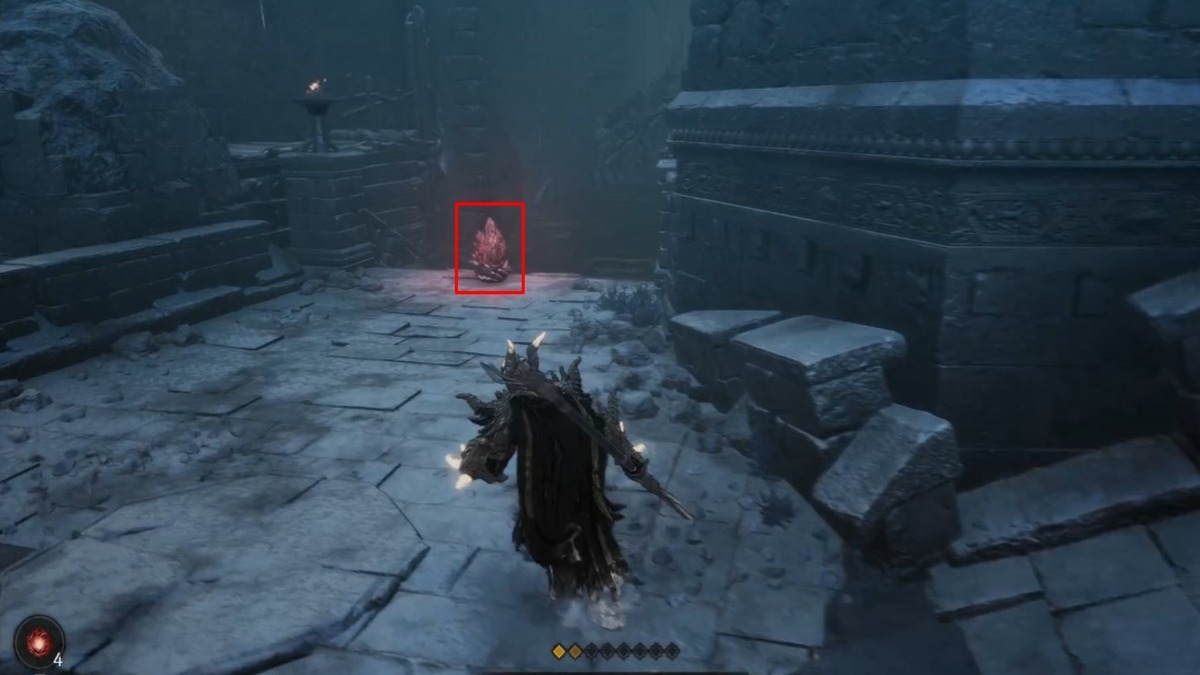 Разбив предыдущий камень души развернитесь и выйдите из комнаты налево, затем снова поверните налево и спуститесь по лестнице. Следуйте по тропе, пока не дойдете до комнаты с очередной лестницей. Спуститесь на нижний уровень. Выйдите из комнаты, поверните налево и продолжайте идти по тропе. Здесь нужно будет победить нескольких врагов. Двигайтесь дальше, поверните налево и поднимитесь по следующей лестнице. Идите прямо, за углом налево найдете камень души. Заодно в комнате справа от лестницы вы можете получить светящийся предмет добычи.