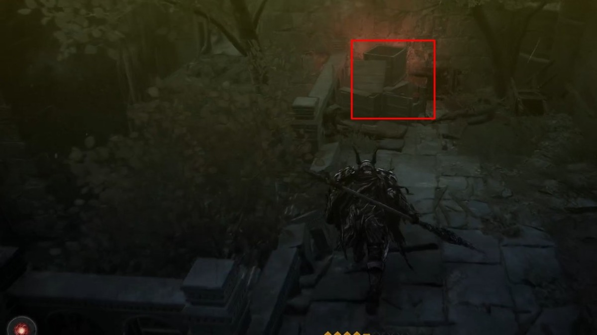 Развернитесь и идите от точки быстрого перемещения Часовни прямо, затем поверните направо через двойные арки. Еще раз поверните направо и увидите иллюзорную стену. Ударьте по ней, в открывшемся пространстве за кучей ящиков находится камень души.