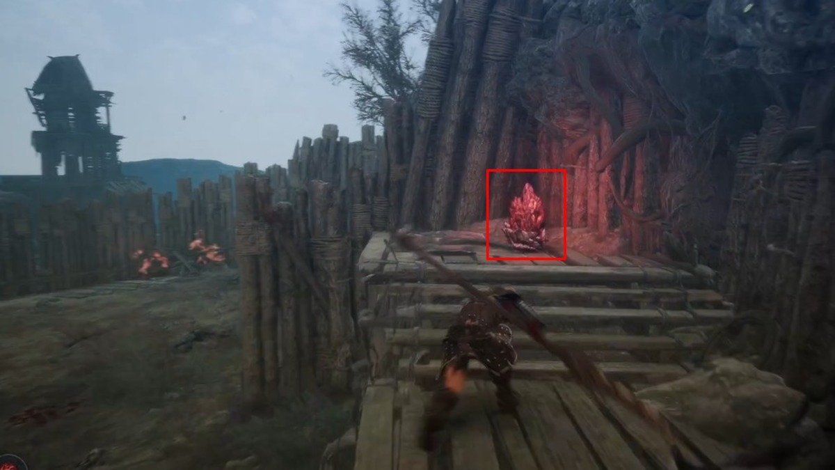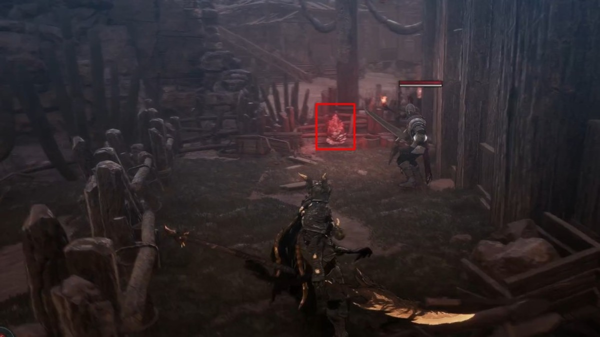 Сразу после входа в главную деревню поднимитесь по лестнице, чтобы добраться до внешней стороны ворот. Откройте большие деревянные ворота и поверните налево. Камень души находится рядом с конструкцией возле бочек.