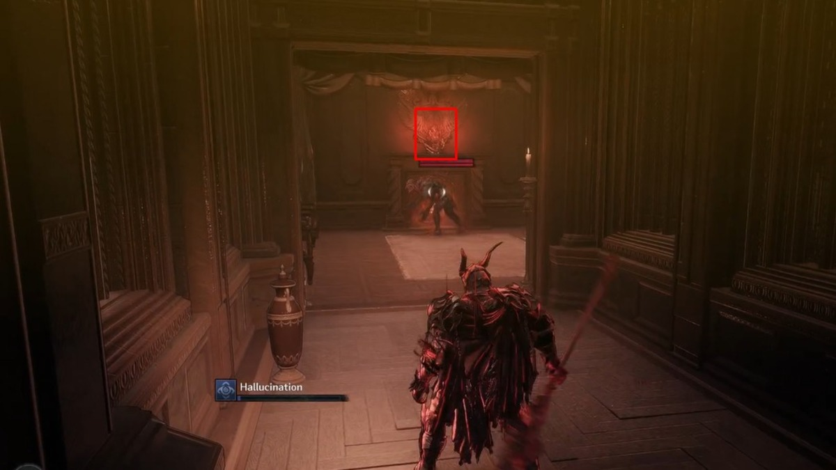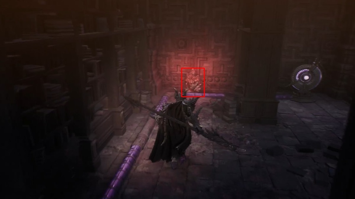 Продолжайте идти вперед по основному пути справа. Вам нужно попасть в область с вращающимися лазерами и несколькими лазерами на полу. Внутри увидите дверь, войдите в нее и продолжайте двигаться по коридору. Вскоре увидите лифт в комнате с кровавыми гробами, поднимитесь на нем и продолжайте бежать вперед. Когда найдете библиотеку, взаимодействуйте с последним книжным шкафом слева и откройте секретную область, где находится камень души.