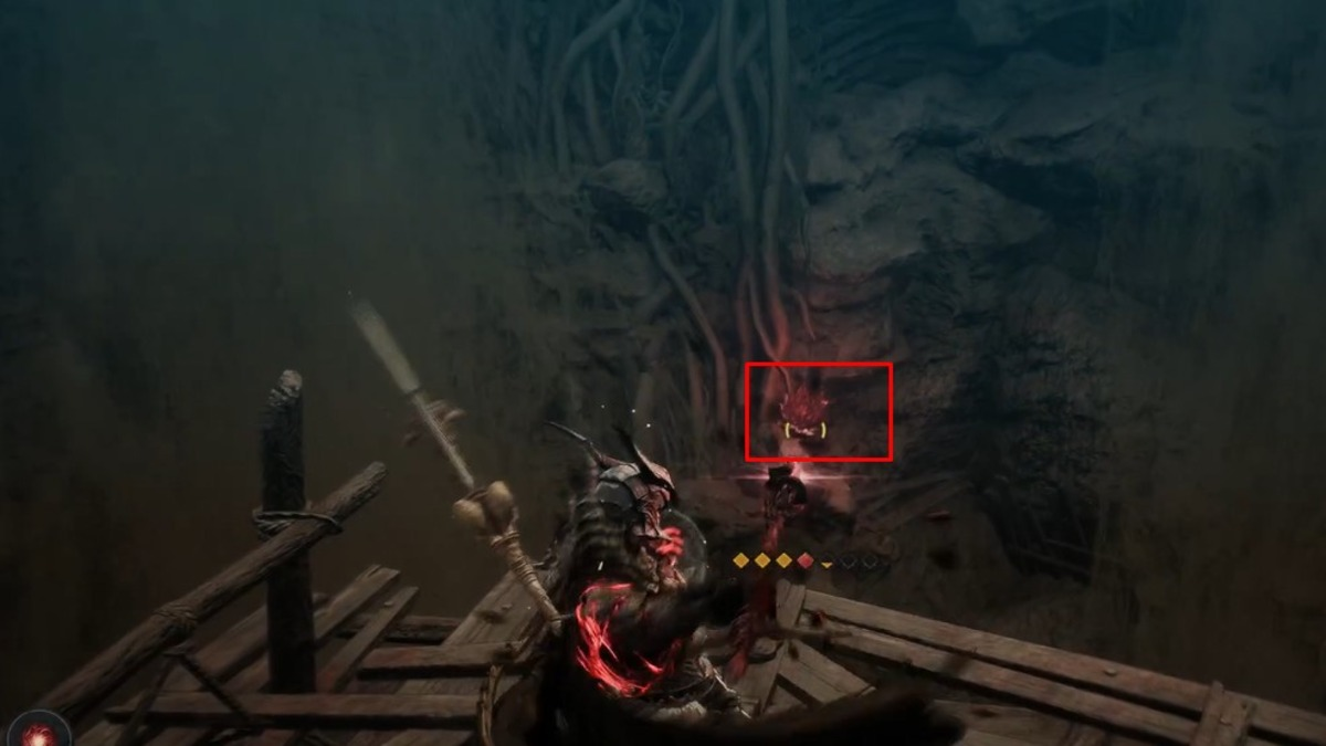 После столкновения с первым элитным врагом пройдите по деревянному мосту и поднимитесь по лестнице. Следуйте по тропе вперед, по пути встретите нескольких пауков и увидите пространство с паучьими яйцами. На небольшой платформе находится камень души. Его надо разбить дистанционной атакой.
