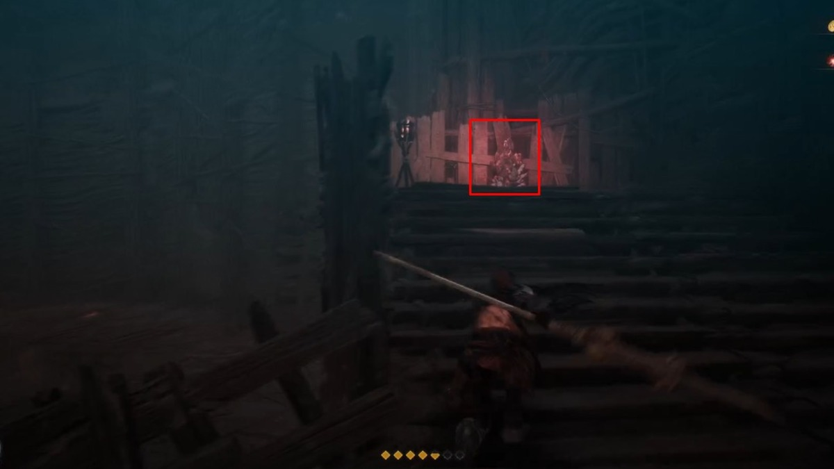 От металлических ворот, ведущих обратно к точке перемещения, спуститесь вниз, где придется сразиться с очередным врагом. Далее поднимитесь по лестнице и продолжайте идти вперед. Справа увидите деревянный барьер, разрушьте его и идите дальше. Впереди за ящиками и бочками найдете очередной камень души.
