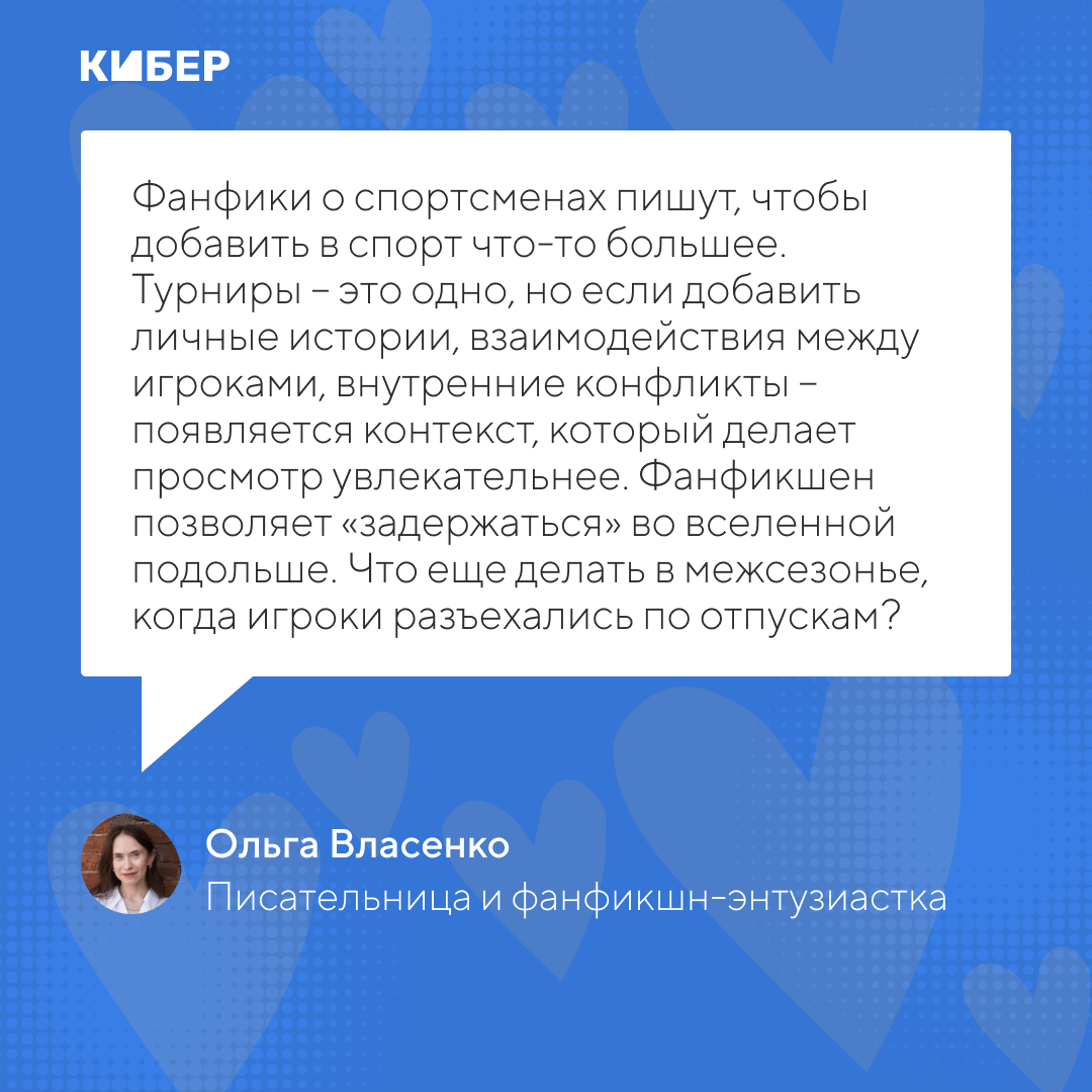 Если говорить о фанфиках про спортсменов – это желание добавить в спорт что-то большее. Турниры – это одно, но если добавить личные истории, взаимодействия между игроками, внутренние конфликты – появляется контекст, который делает просмотр увлекательнее. Фанфикшн позволяет задержаться во вселенной подольше. Что еще делать в межсезонье, когда игроки разъехались по отпускам?»