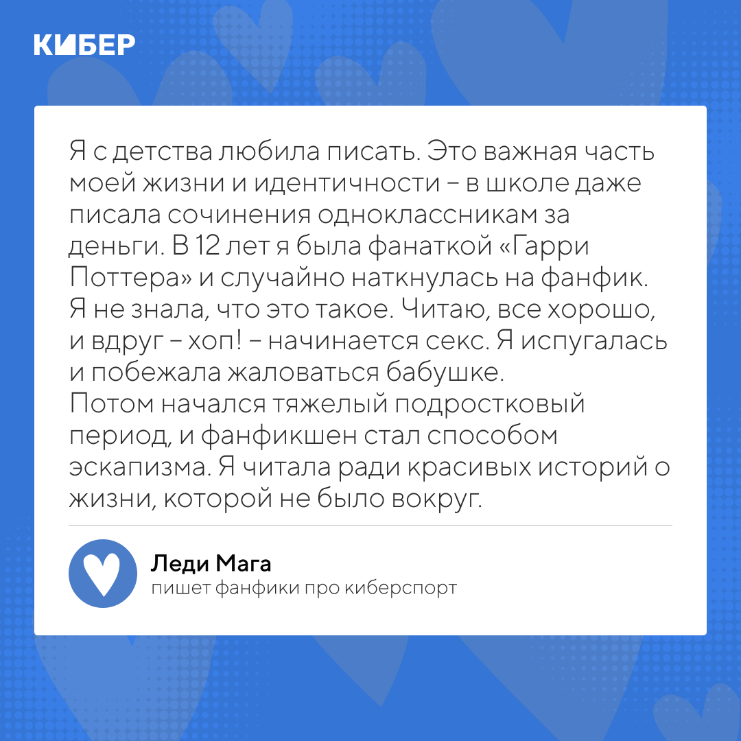 «Я с детства любила писать. Это важная часть моей жизни и идентичности, в школе даже писала сочинения одноклассникам за деньги. В 12 лет я была фанаткой «Гарри Поттера» и случайно наткнулась на фанфик. Я не знала, что это такое, и тем более не подозревала о возрастных и жанровых метках. Читаю, все хорошо, и вдруг – хоп! – начинается секс. Я испугалась и побежала жаловаться бабушке.