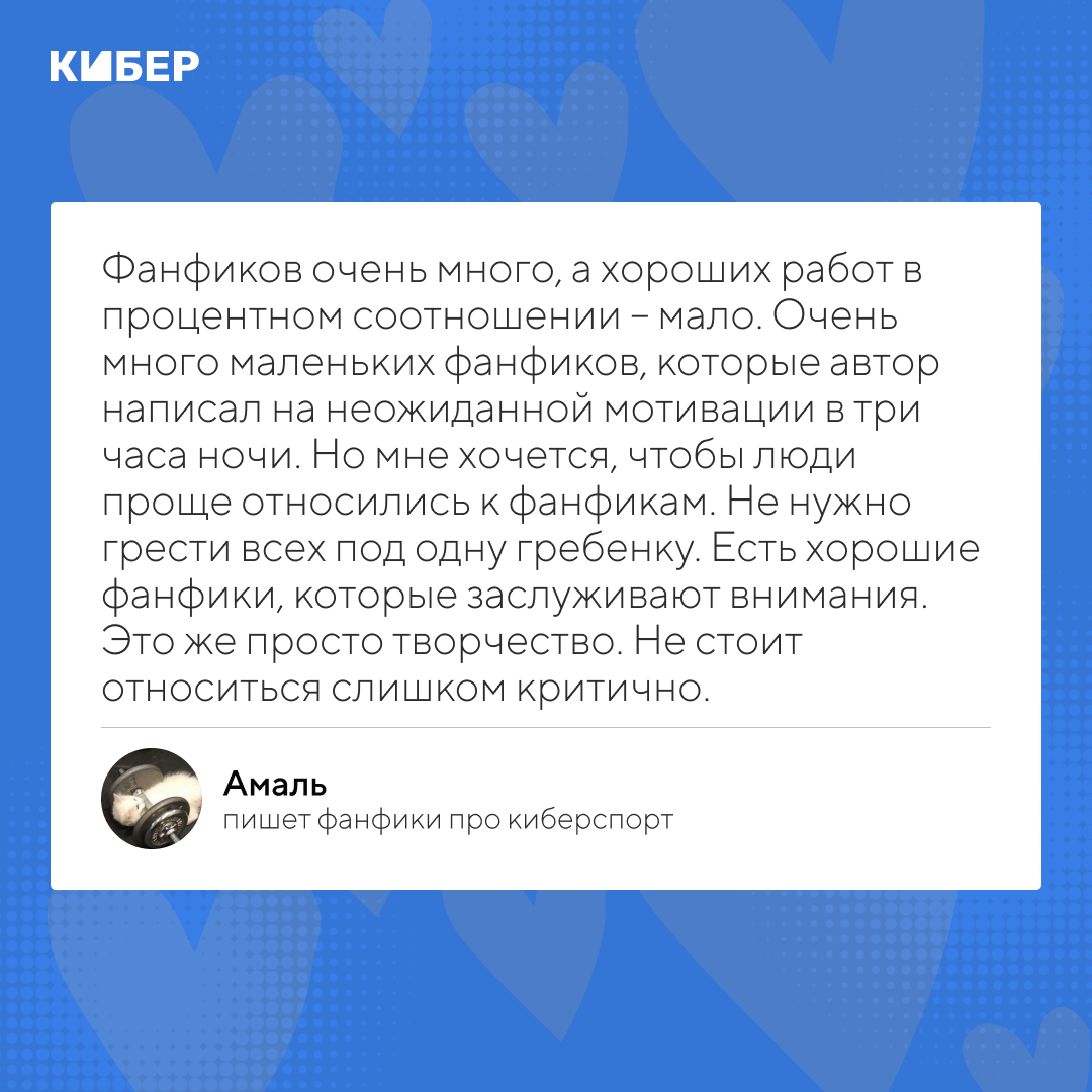 «Фанфиков очень много, а хороших работ в процентном соотношении – мало. Очень много маленьких фанфиков, которые автор написал на неожиданной мотивации в три часа ночи. Но мне хочется, чтобы люди проще относились к фанфикам. Не нужно грести всех под одну гребенку. Есть хорошие фанфики, которые заслуживают внимания. Это же просто творчество. Не стоит относиться слишком критично», – рассказывает Амаль.