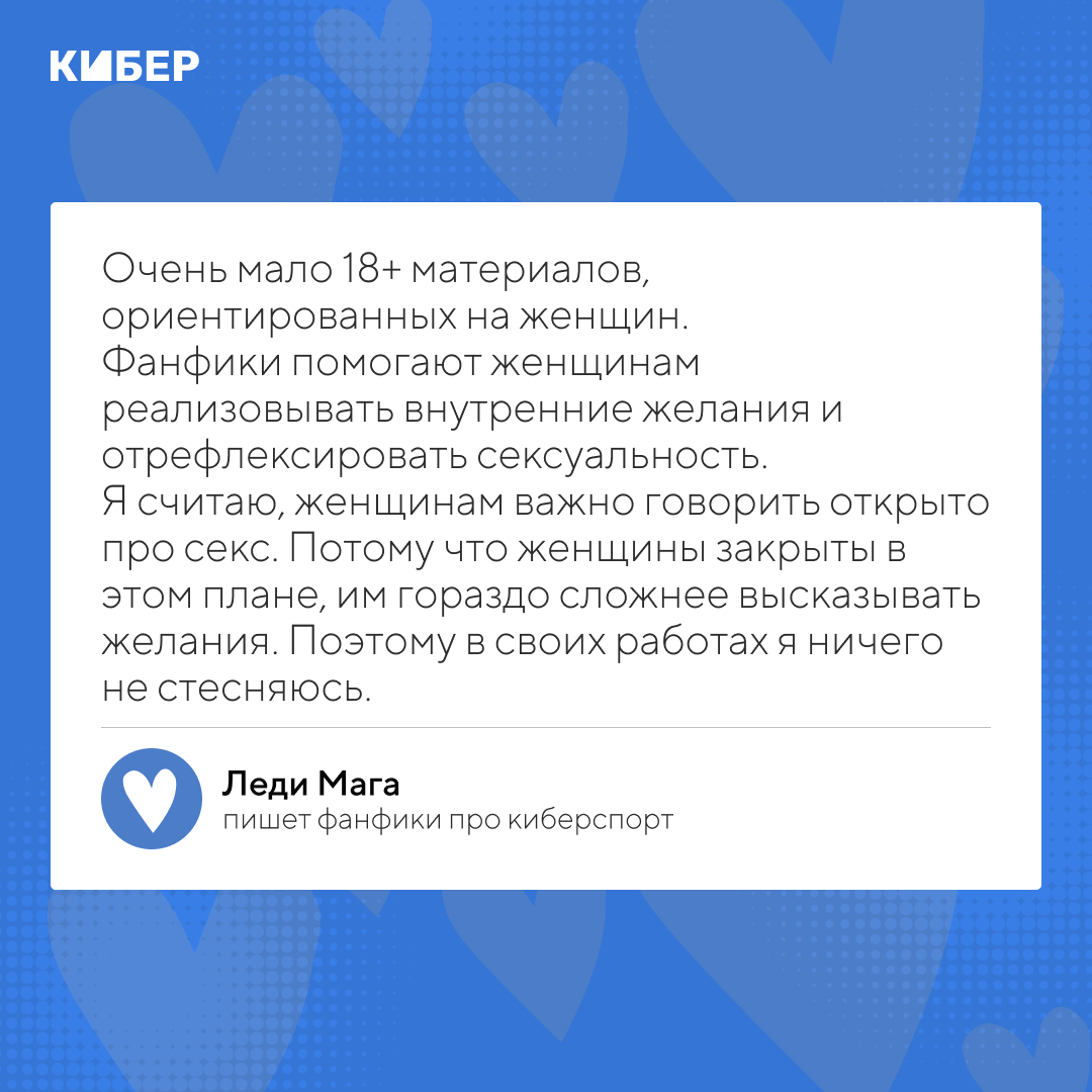 «Очень мало 18+ материалов, ориентированных на женщин. И фанфики помогают женщинам свою сексуальность и внутренние желания реализовывать или отрефлексировать. Я считаю, что очень важно говорить открыто про секс, особенно если ты женщина. Потому что женщины закрыты в этом плане, им гораздо сложнее высказывать желания. Поэтому в своих работах я ничего не стесняюсь», – говорит Леди Мага.