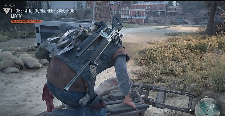 Получив информацию о последнем месте пребывания бандита надо отправиться к лесопилке. На карте будет синим выделена область для исследования. Первым делом идите к сломанному байку, далее к заброшенному лагерю HEPO.